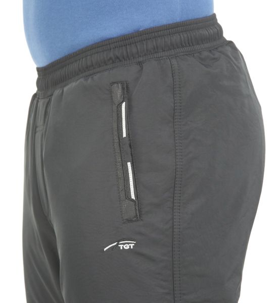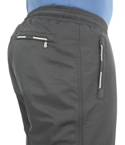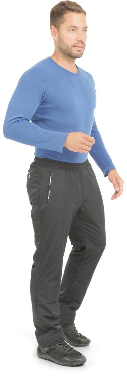 Зимние брюки с поясом на резинке. Пояс фиксируется шнурком. Для дополнительной фиксации в пояс с внутренней стороны вставлен шнурок. Брючины заужены книзу. Имитация гульфика. Два передних и задний карманы на молниях под листочками, декорированными принтованной плащёвкой и вышивками. Под левым передним карманом вышивка в фирменном стиле.