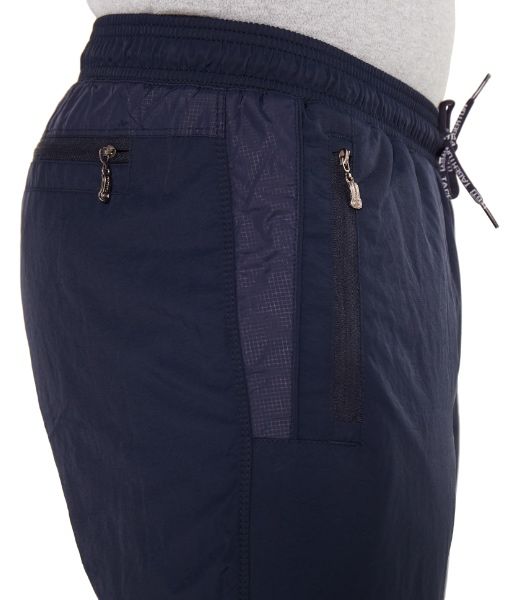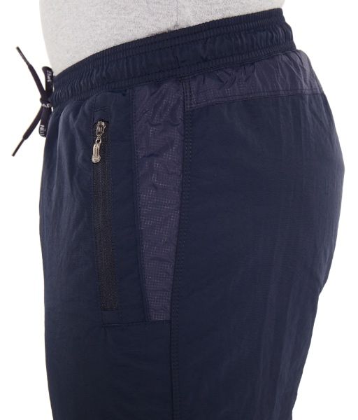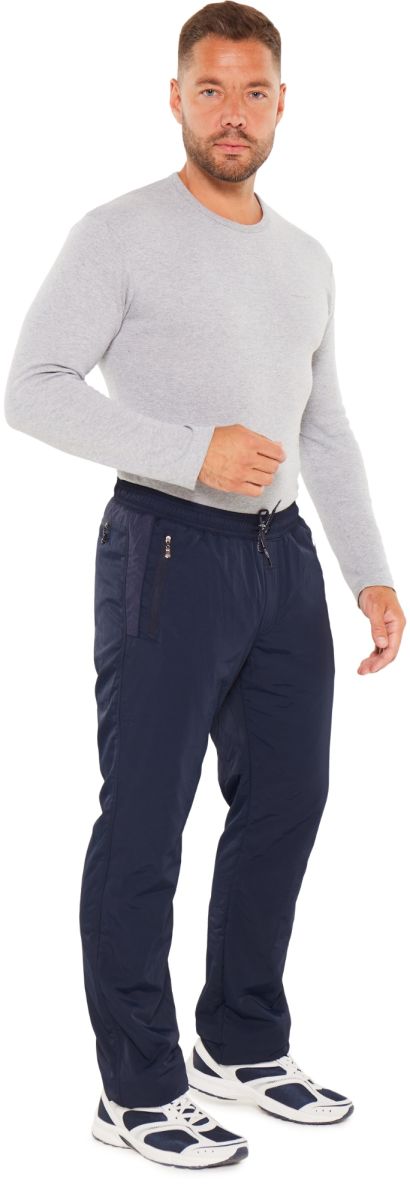 Зимние брюки с поясом на резинке. Для дополнительной фиксации в пояс снаружи вставлен шнурок с наименованием торговой марки. Брючины заужены книзу. Имитация гульфика. Декоративные вставки и задняя кокетка выполнены из принтованной нейлон таффеты в тон основного материала. Два передних и задний карманы фиксируются полупотайными молниями.