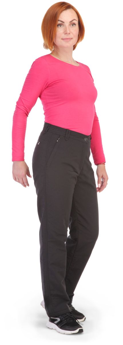 Зимние женские брюки для повседневного использования. Ткань на основе хлопковых волокон обеспечивает максимальный комфорт. Гульфик на молнии. Пояс полужёсткий с резинкой по бокам. Фиксируется пуговицей. По периметру пояса пришиты шлёвки под ремень. Посадка высокая комфортная. Брючины немного заужены книзу. Сзади кокетка, под которой находится карман. Передние и задний карманы на молниях под листочками