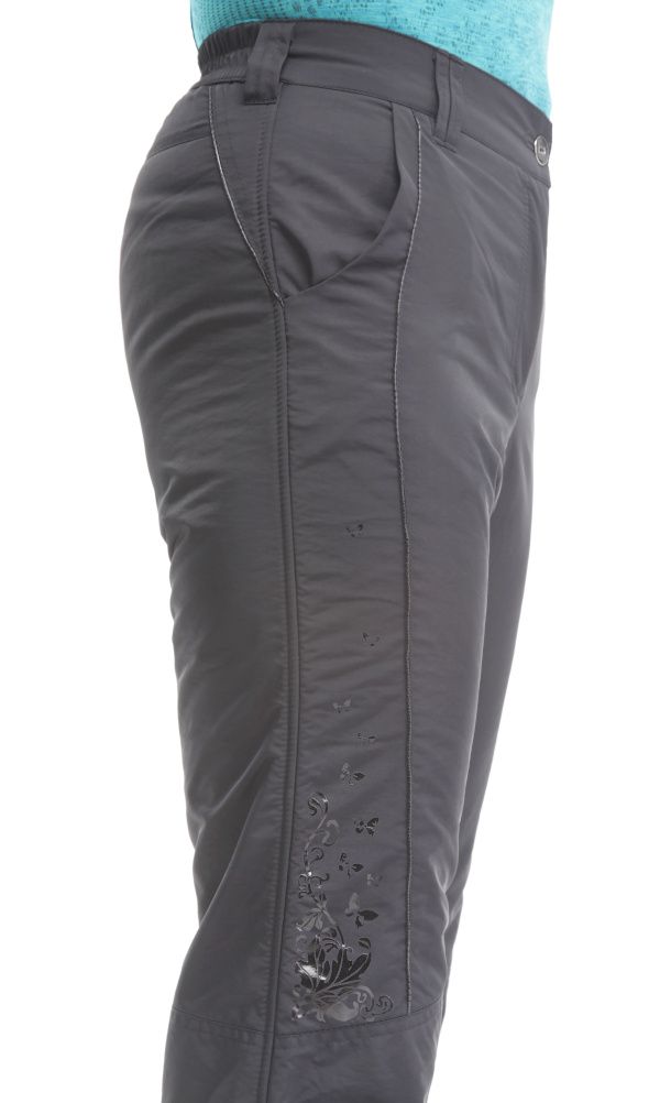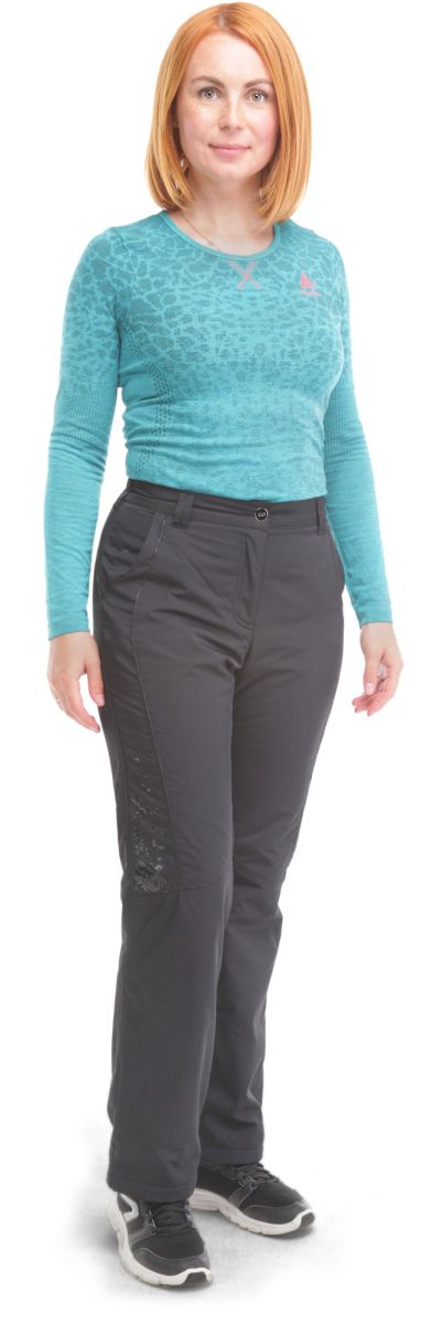 Зимние брюки с гульфиком на молнии. Пояс полужёсткий с резинкой сзади. Фиксируется пуговицей. Посадка высокая, комфортная. Передние карманы открытые полукруглые. По бокам на брючинах горизонтальными рельефами и кантами выделены вставки с декоративным принтом. Сзади кокетка.