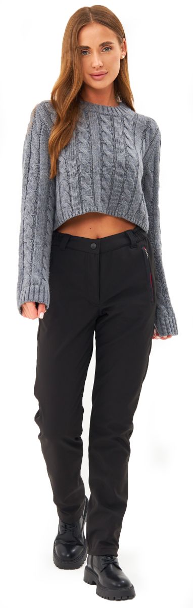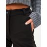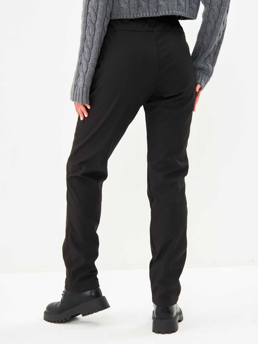 Зимние женские брюки из ткани Windstopper Softshell для спорта и активного отдыха. Ткань представляет собой трёхслойную систему, состоящую из лицевой ткани (эластичный полиэстер), мембраны (защита от ветра и паропроницаемость) и утеплителя (флис), соединенных в единое целое. Благодаря такой структуре обладает водоотталкивающими свойствами и в то же время пропускает водяной пар, т.е. способна "дышать". Наличие нитей эластана делает ткань подвижной, а изделие более комфортным. Гульфик на молнии. Пояс полужёсткий с резинкой по бокам. Фиксируется кнопкой-крючком. Внутренняя сторона пояса и мешковины карманов выполнены из тонкого трикотажного полотна-утеплителя (рашель). По периметру пояса пришиты шлёвки под ремень. Посадка высокая комфортная. Брючины немного заужены книзу. Передние карманы фиксируются цветными молниями, прикрытыми узкими листочками из принтованной таффеты.