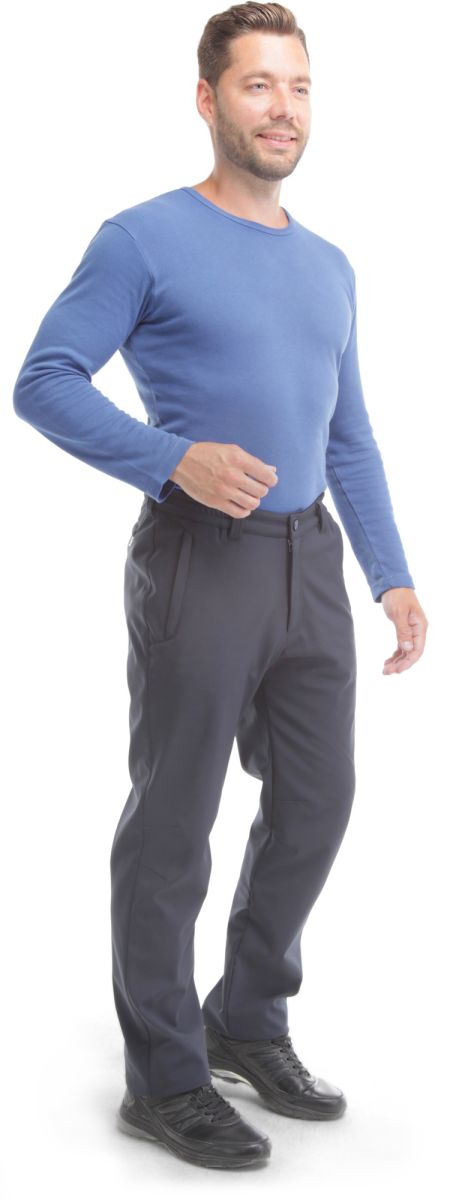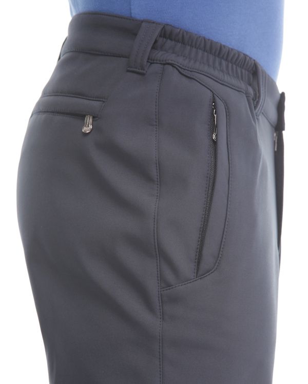 Зимние брюки из ткани Windstopper Softshell для спорта и активного отдыха. Ткань представляет собой трёхслойную систему, состоящую из лицевой ткани (эластичный полиэстер), мембраны (защита от ветра и паропроницаемость) и утеплителя (флис), соединенных в единое целое. Благодаря такой структуре обладает водоотталкивающими свойствами и в то же время пропускает водяной пар, т.е. способна "дышать". Наличие нитей эластана делает ткань подвижной, а изделие более комфортным. Гульфик на молнии. Пояс полужёсткий с резинкой по бокам. Фиксируется кнопкой-крючком. Внутренняя сторона пояса и мешковины карманов выполнены из тонкого трикотажного полотна-утеплителя (рашель) в тон основного материала. По периметру пояса пришиты шлёвки под ремень. Передние карманы на молниях под листочками. Область входа в карманы выделены рельефами. Задний карман на молнии под листочкой. Колени выделены выточками.