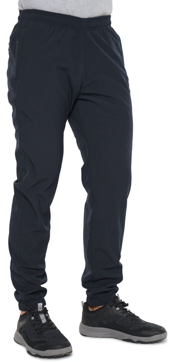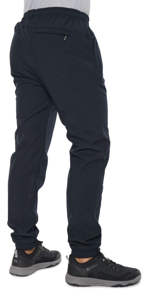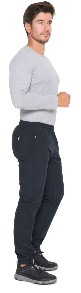 Для дополнительной фиксации в пояс с внутренней стороны вставлен шнурок. Брючины заужены книзу и заканчиваются манжетами.