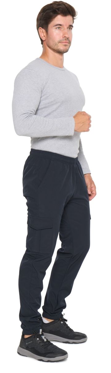 Для дополнительной фиксации в пояс с внутренней стороны вставлен шнурок. Брючины заужены книзу и заканчиваются манжетами.