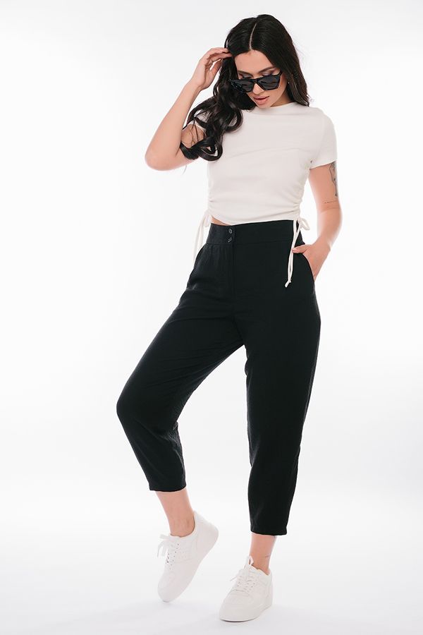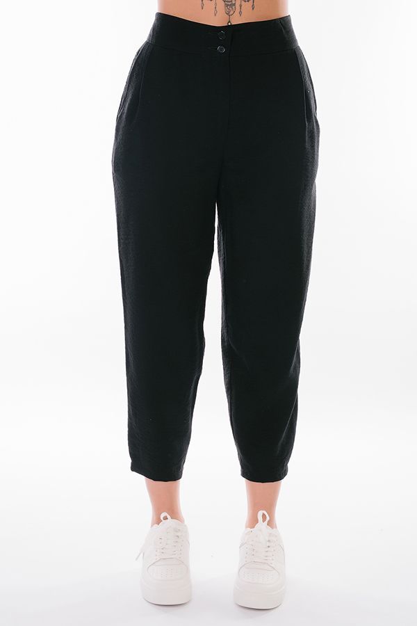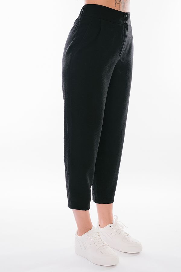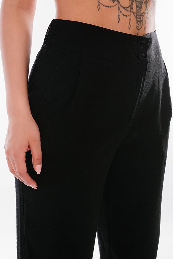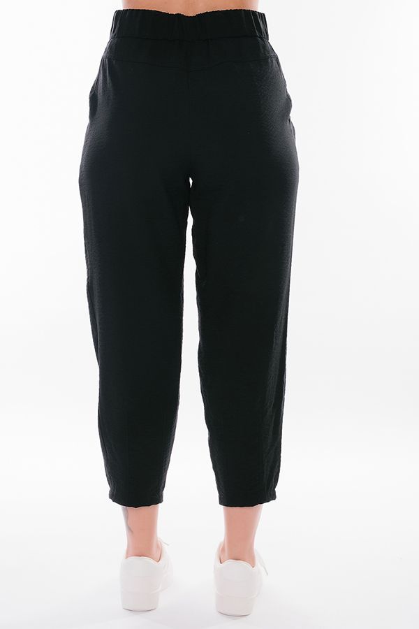 Брюки-бананы из легкой вискозной летней ткани. Детали: спереди застежка на молнию и две пуговицы, по линии пояса по бокам защипы, полноценные боковые карманы с отрезным бочком. Сзади кокетка. По линии низа оригинальная отделка (две вертикальные вытачки). В поясе, по спинке издели резина. Длина по внутреннему шву -64 см. Ширина по линии низа - 15 см. *Числовые параметры соответствуют размеру 42. Размер модели на фото: 46. Параметры модели: 86-64-100. Рост модели на фото: 174 см.