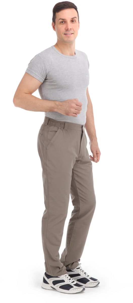 Летние брюки с гульфиком на молнии. Пояс полужёсткий с резинками по бокам, фиксируется джинсовой пуговицей. На поясе шлёвки под ремень. Брючины заужены книзу. Передние карманы открытые. Сзади кокетка, ниже которой расположены карманы на молниях под листочками. Все карманы декорированы хольнитенами. Кокетка и входы в передние карманы отстрочены тройными швами.