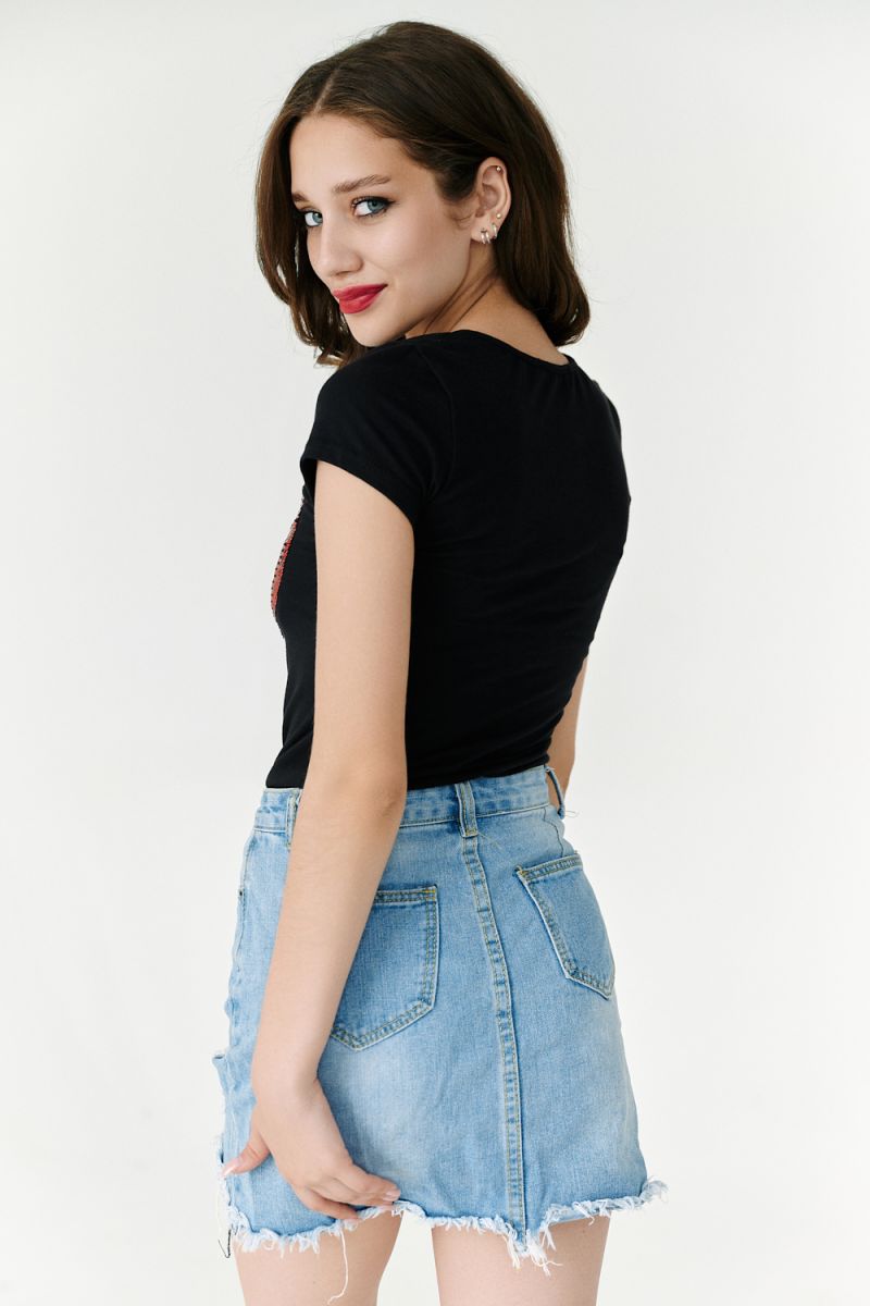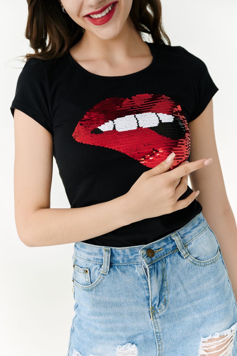 Футболка полуприлегающего силуэта, с округлой горловиной, длиной до середины бедра. Рукав втачной короткий. Горловина обработана бейкой из основного полотна.