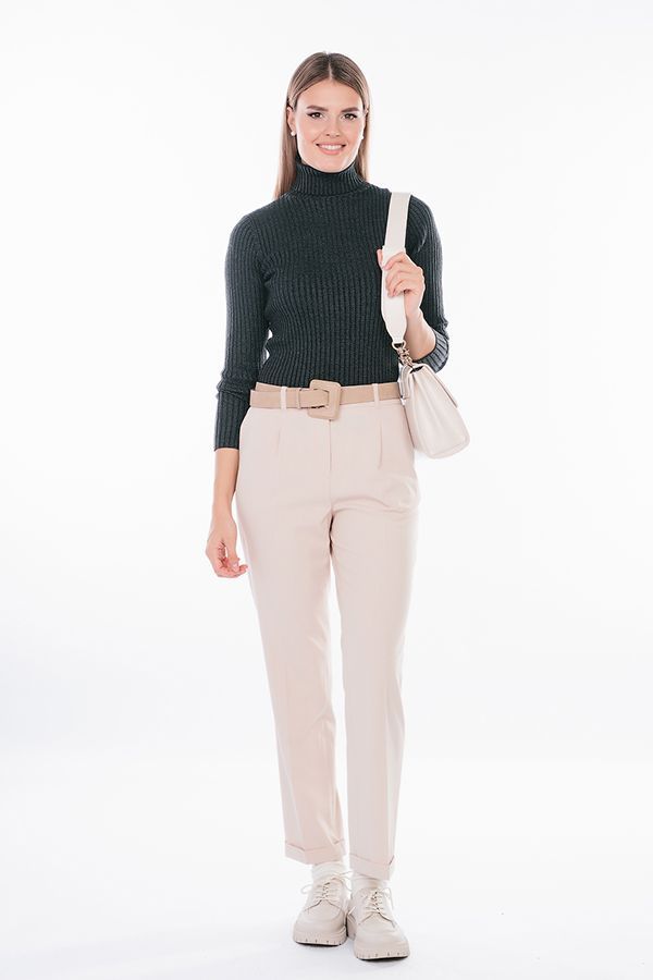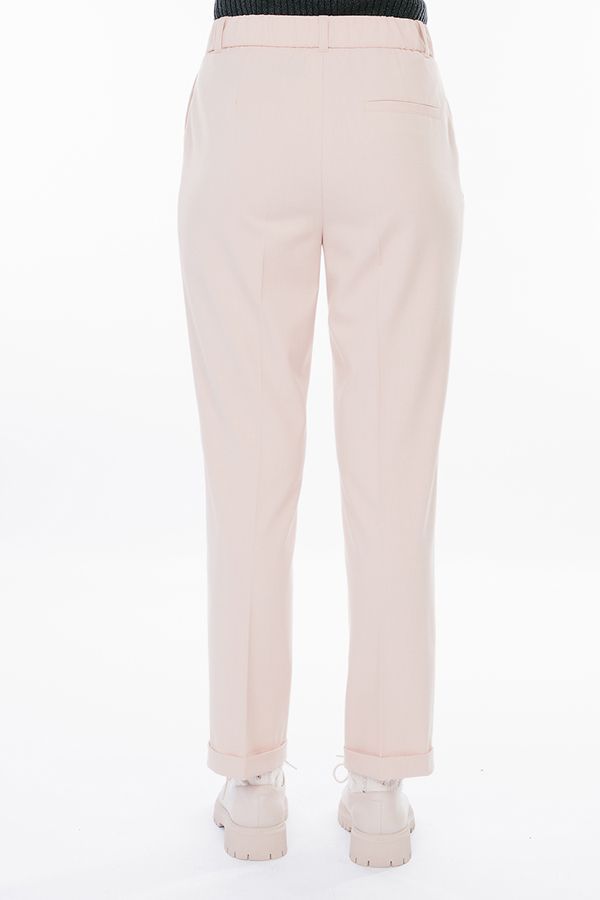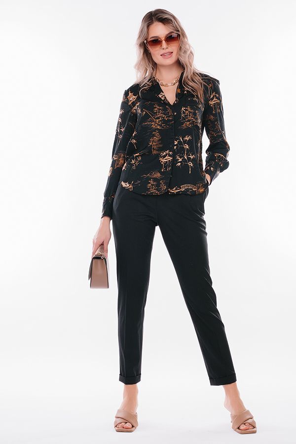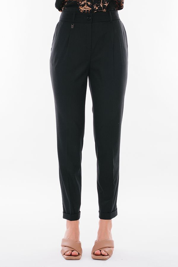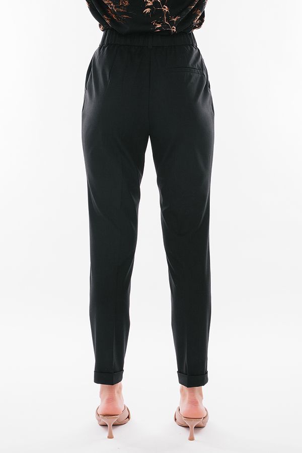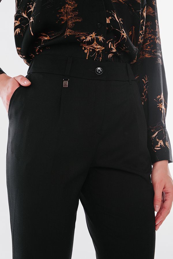 Модель в городском стиле со стрелкой из легкой ткани. Идеальное решение для офиса в не жаркий летний день. Детали: по передней половинке защипы, шлевки на фигурном поясе, застежка на молнию и пуговицу, боковые карманы с отрезным бочком, украшение с логотипом. Сзади под вытачками листочка с имитацией кармана. По задней половинке брюк, в поясе резина на сборке. Длина брюк регулируется отворотом по линии низа. Длина по внутреннему шву - 73 см. Ширина по линии низа - 16,5 см. *Числовые параметры соответствуют размеру 44. Размер модели на фото: 44. Параметры модели: 86-63-94. Рост модели на фото: 173 см.