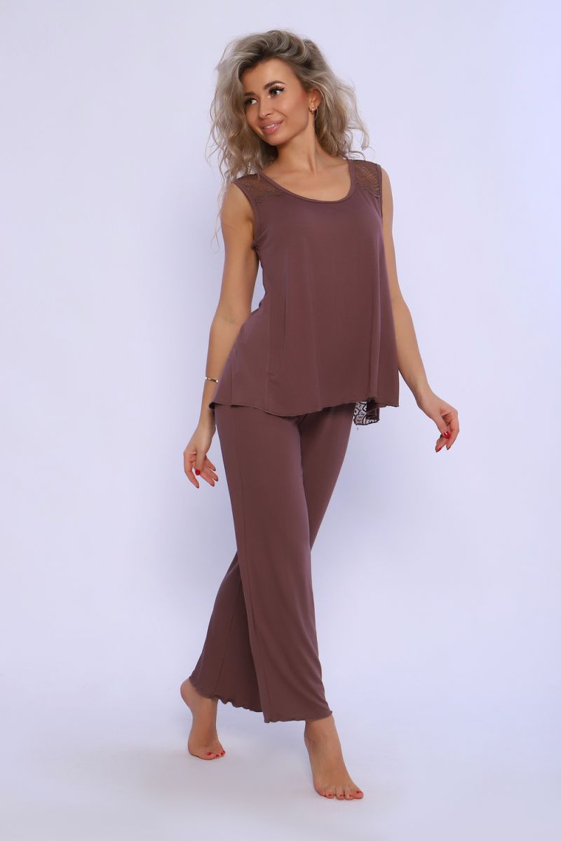 Шикарная пижама для самых красивых, для нас милые женщины. Пижама выполнена из мягкого, приятного к телу материала, конечно это наша всеми любимая вискоза. Верхняя часть кофточки по плечам красивое кружево, по задней части кружево в разлет, низ обработан под краевку, рукава и горловина под окантовку. Брюки палаццо, низ обработан краевкой.