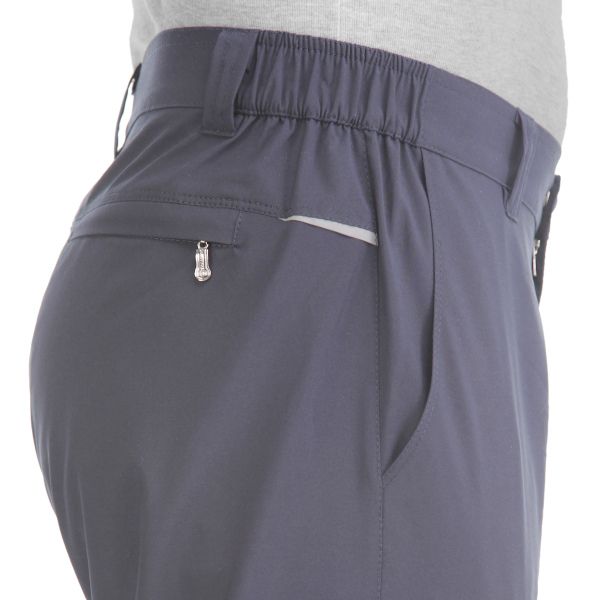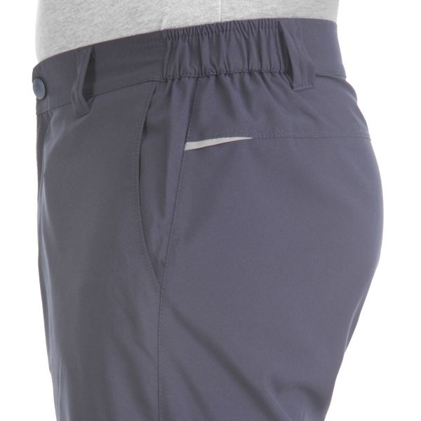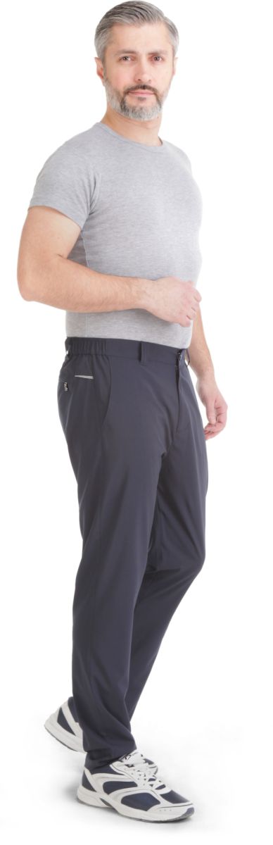Летние брюки с гульфиком на молнии. Пояс полужёсткий с резинками по бокам, фиксируется кнопкой-крючком. На поясе шлёвки под ремень. Отшиты из тонкого гладкого синтетического материала (бистреч). Нити эластана расположены как по утку, так и по основе ткани, что придаёт материалу чрезвычайную подвижность, формоустойчивость и комфорт в носке. Брючины заужены книзу. Передние карманы полукруглые открытые. Сзади кокетка. По бокам в шов кокетки вставлены декоративные элементы из светоотражающей стропы. Ниже кокетки с правой стороны расположен карман на молнии под листочкой.