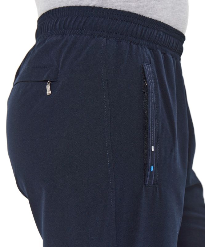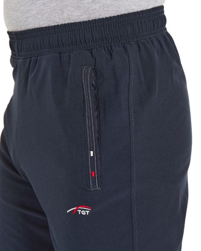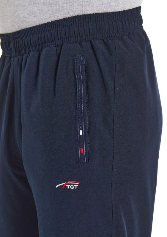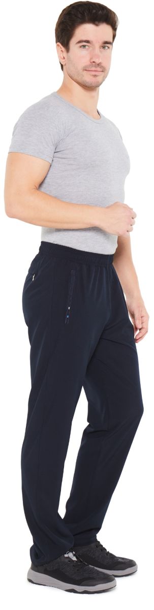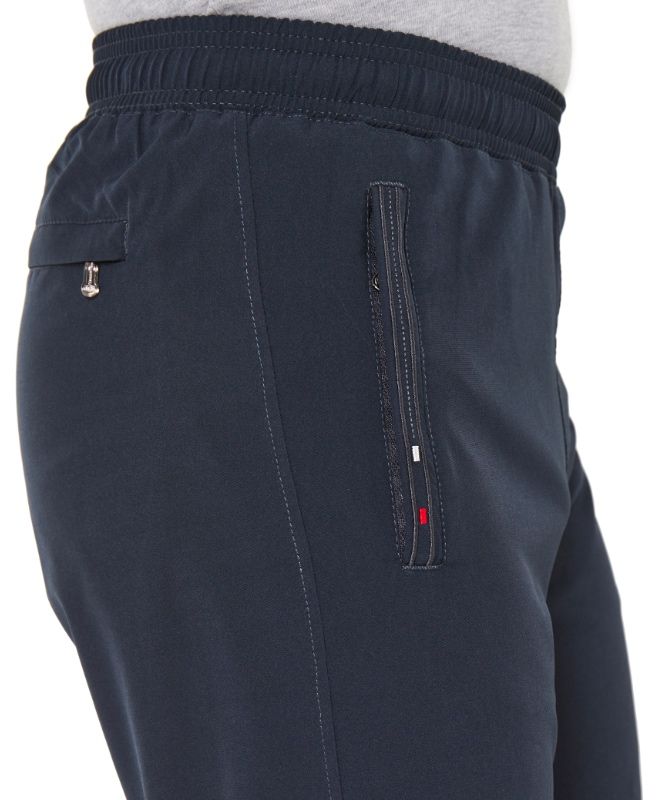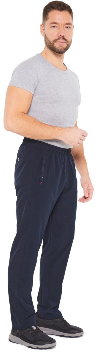 Летние брюки с поясом на резинке, отшиты из тонкого гладкого синтетического материала (бистреч). Нити эластана расположены как по утку, так и по основе ткани, что придаёт материалу чрезвычайную подвижность, формоустойчивость и комфорт в носке. Для дополнительной фиксации в пояс с внутренней стороны вставлен шнурок. Брючины заужены книзу. Передние карманы на молниях под листочками, декорированными цветными вышивками. Сзади кокетка, под которой расположен карман на молнии, прикрытый листочкой. Под левым передним карманом вышивка в фирменном стиле.