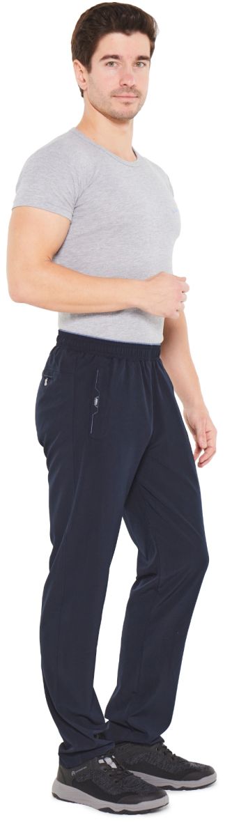 Для дополнительной фиксации в пояс с внутренней стороны вставлен шнурок. Брючины заужены книзу. Передние карманы на молниях под листочками, декорированными цветными вышивками. Сзади кокетка, под которой расположен карман на молнии, прикрытый листочкой.