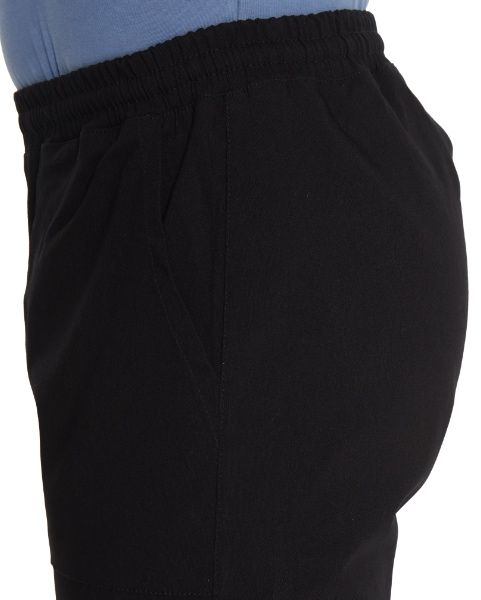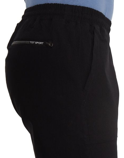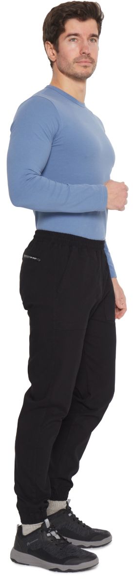 Для дополнительной фиксации в пояс с внутренней стороны вставлен шнурок. Брючины заужены книзу и заканчиваются манжетами. Передние карманы открытые. Сзади кокетка, под которой расположен горизонтальный карман, фиксирующийся прорезиненной полупотайной молнией с принтом по корду.