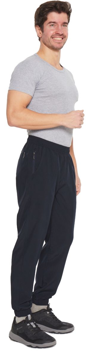 Ткань мягкая, приятная на ощупь, не нагревается в жару и создаёт ощущение прохлады. Для дополнительной фиксации в пояс с внутренней стороны вставлен шнурок. Брючины заужены книзу и заканчиваются манжетами. Передние карманы открытые, с правой стороны расположен дополнительный вертикальный карман, фиксируемый полупотайной молнией. Сзади кокетка, под которой расположен карман на молнии.