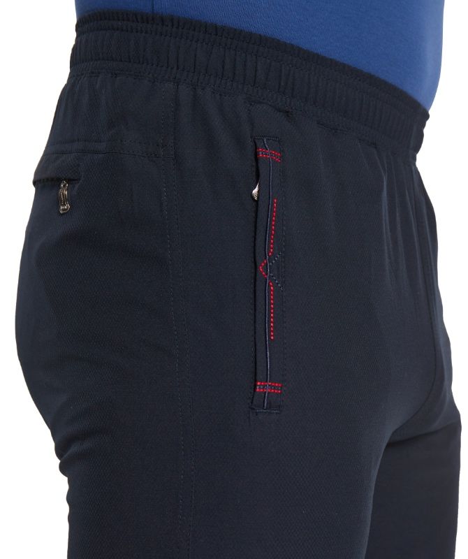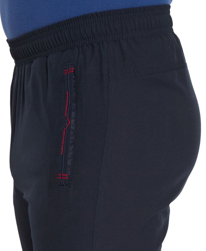 Для дополнительной фиксации с внутренней стороны в пояс вставлен шнурок. Брючины немного заужены книзу. Отшиты из тонкого синтетического материала, содержащего жаккардовые нити и эластан. Нити эластана расположены как по утку, так и по основе ткани, что придаёт материалу чрезвычайную подвижность, формоустойчивость и комфорт в носке.