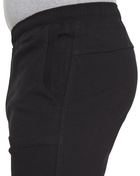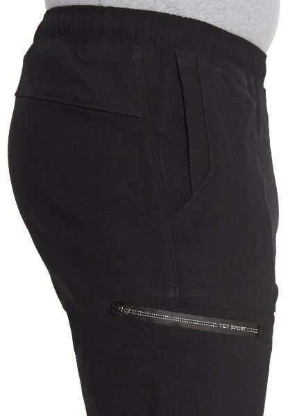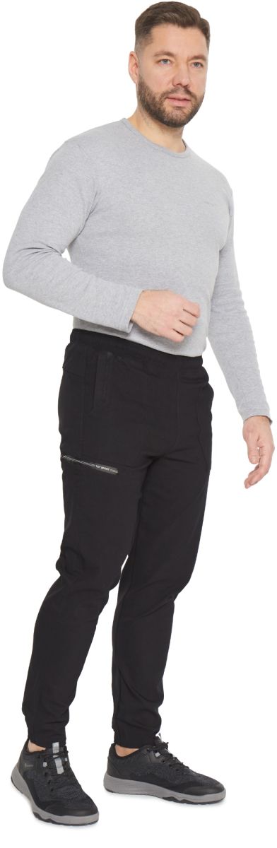 Джоггеры с поясом на резинке. Отшиты из плотной ткани на основе вискозы с добавлением эластана, что придаёт материалу чрезвычайную подвижность, формоустойчивость и комфорт в носке. Ткань получена из натуральных волокон, гигиенична, приятна в жару, так как создает ощущение прохлады. Для дополнительной фиксации в пояс с внутренней стороны вставлен шнурок. Брючины заужены книзу и заканчиваются манжетами. Передние карманы открытые. На правой брючине расположен дополнительный горизонтальный карман, фиксирующийся прорезиненной полупотайной молнией с принтом по корду. Сзади кокетка.