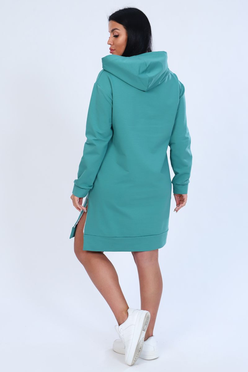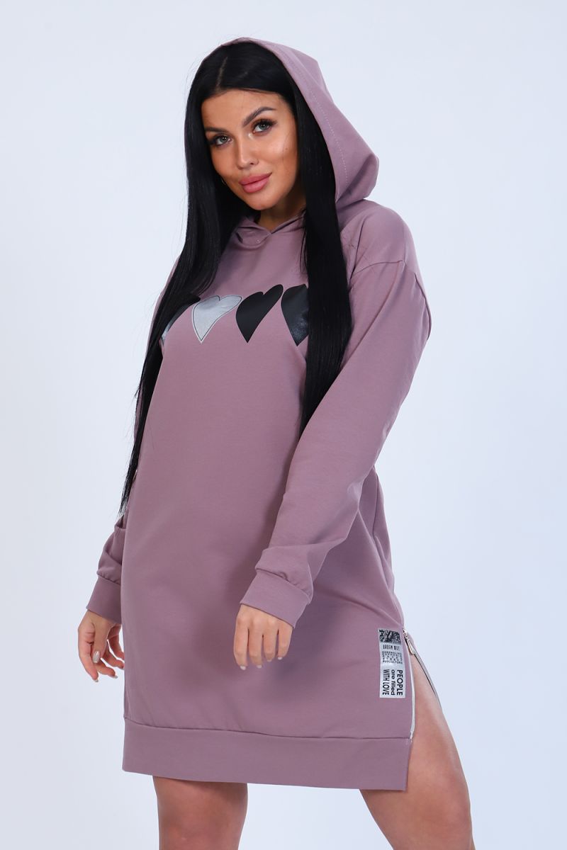 Туника женская из мягкого футера с лайкрой 2-х нитка, качества карде. Модель с капюшоном, спущенная пройма, длинный рукав и низ туники обработаны широким манжетом. На передней полочке стильный принт в виде сердец и в виде шеврона внизу, в боковом шве функциональная декоративная молния. Модное, уютное платье отличный вариант офисного гардероба для современной деловой девушки.