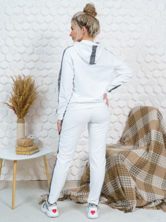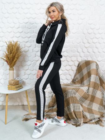 Стильный костюм с контрастными лампасами в стиле спорт-шик состоит из худи и брюк, выполнен из высококачественного трикотажного полотна. Модель прямого силуэта. Горловина обработана уютным двойным капюшоном на цельнокроеной стойке, декорированный люверсами и шнурком. Перед с карманом-кенгуру, с длинным рукавом реглан. Низ рукава и низ худи обработаны приточными манжетами. Брюки прямого силуэта, с боковыми карманами, комфортной посадкой на талии, которую обеспечивает пояс на эластичной резинке. Эффектный костюм для активного образа жизни, всегда стильно, современно и модно.
