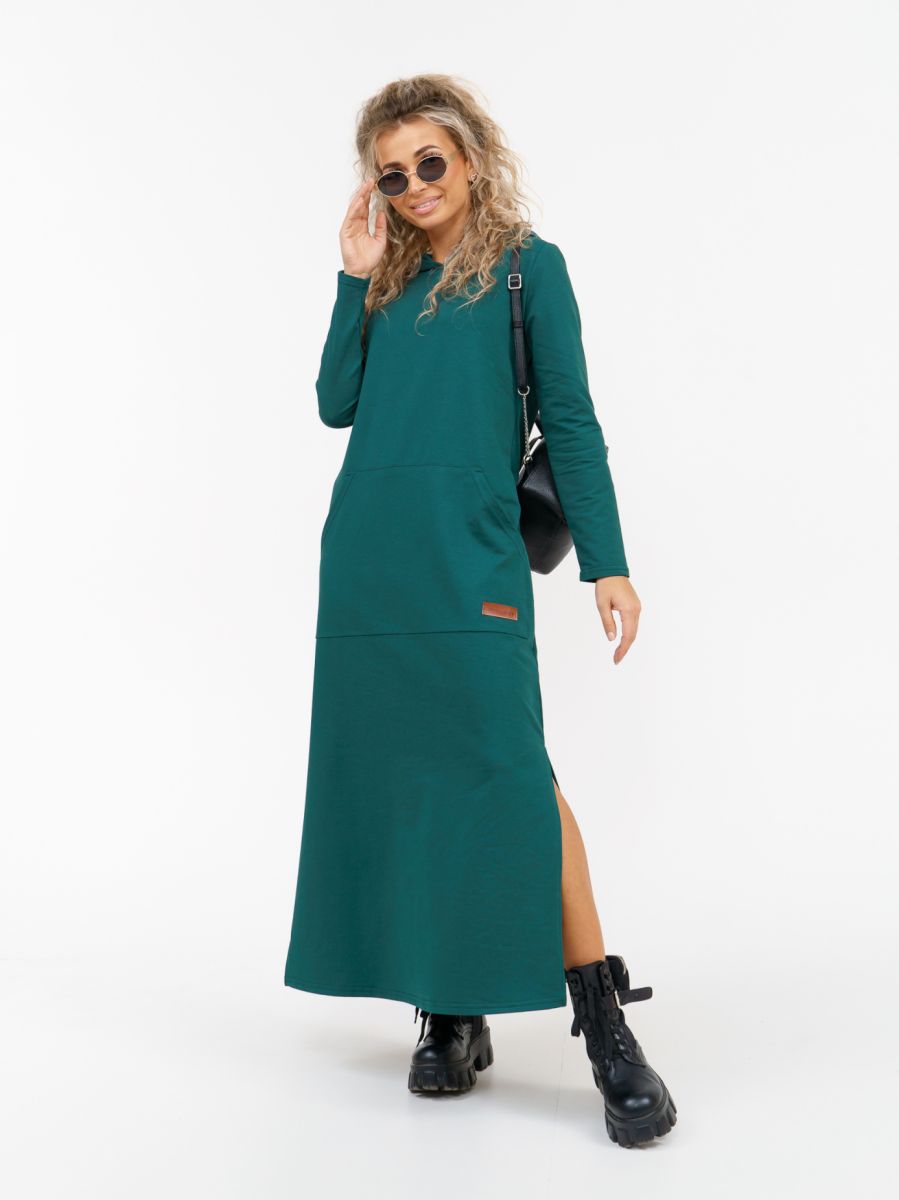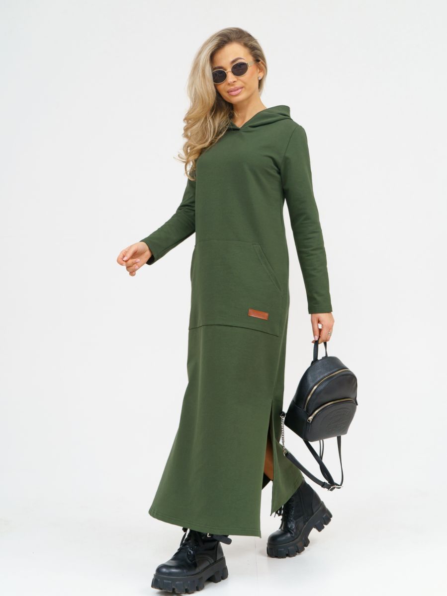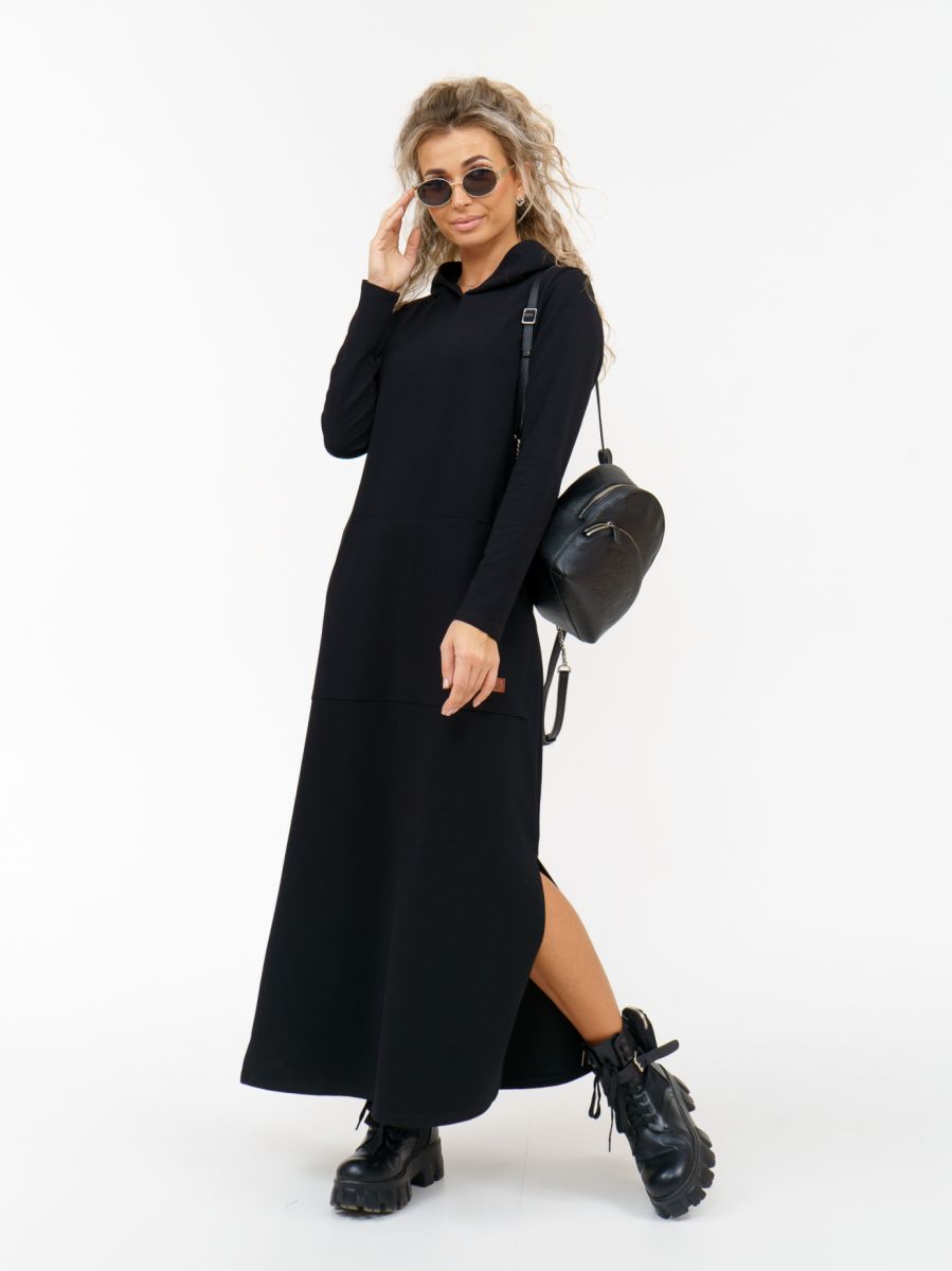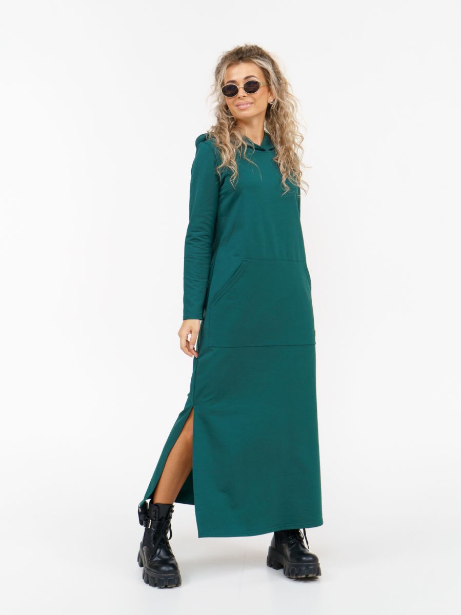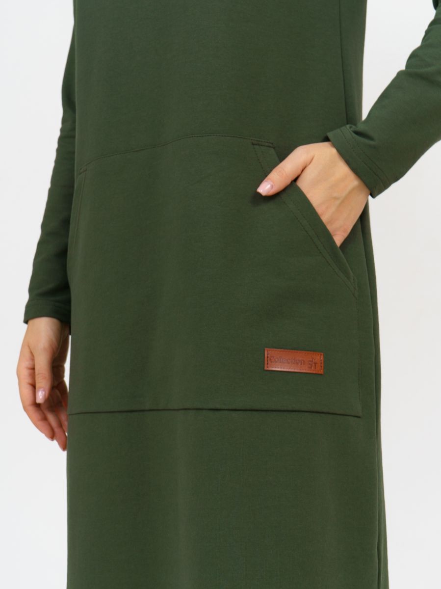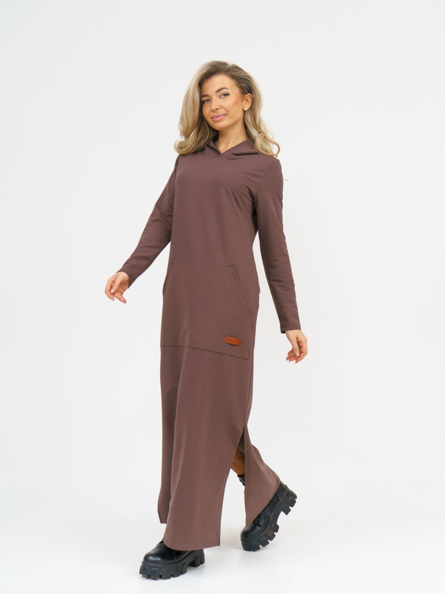 Длинное платье прямого силуэта с капюшоном и накладным карманом "кенгуру".