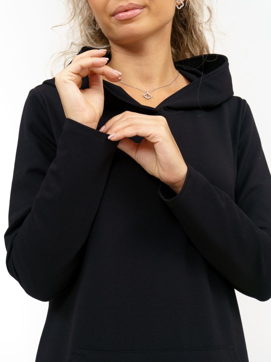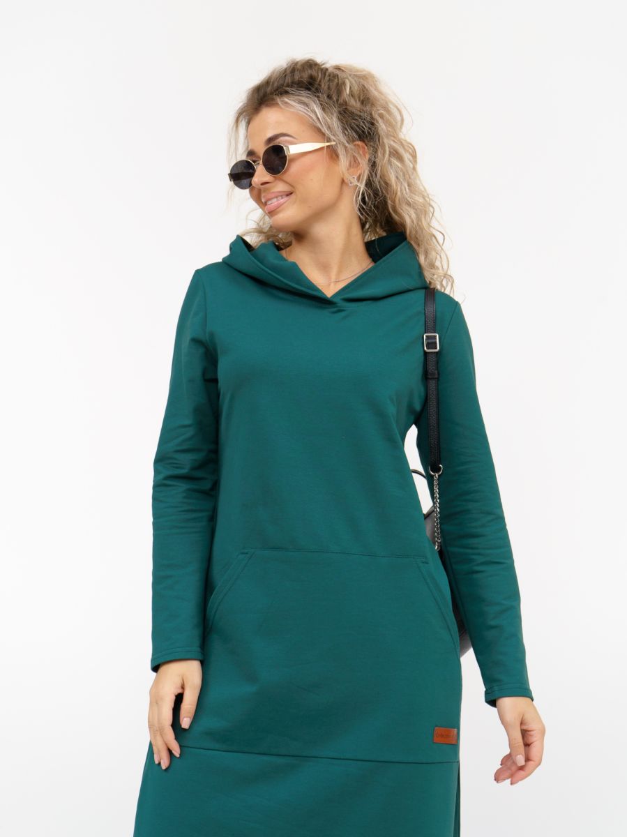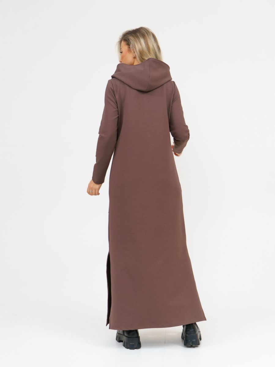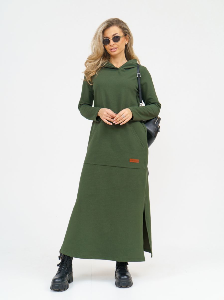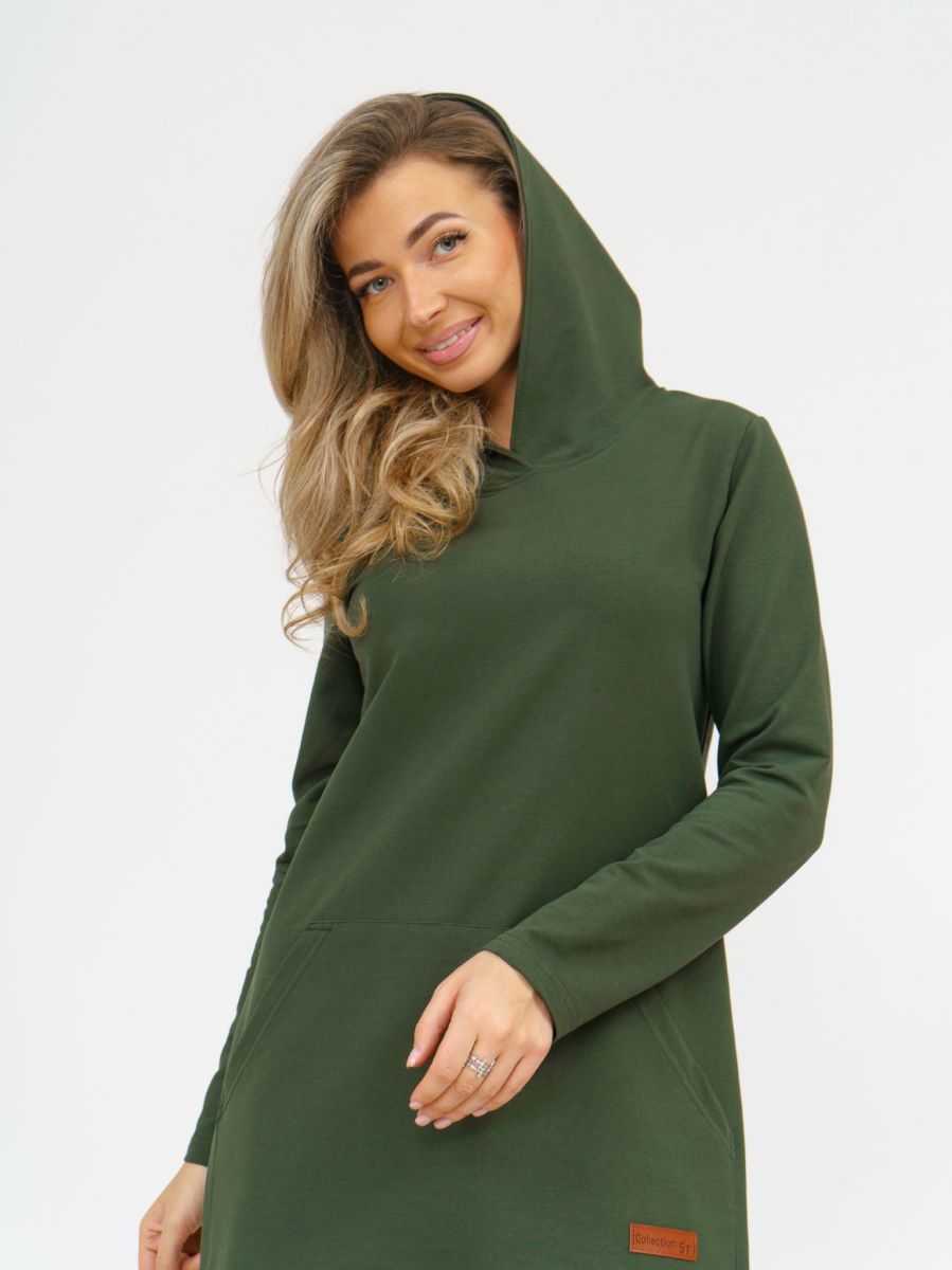 Длинное платье прямого силуэта с капюшоном и накладным карманом "кенгуру".