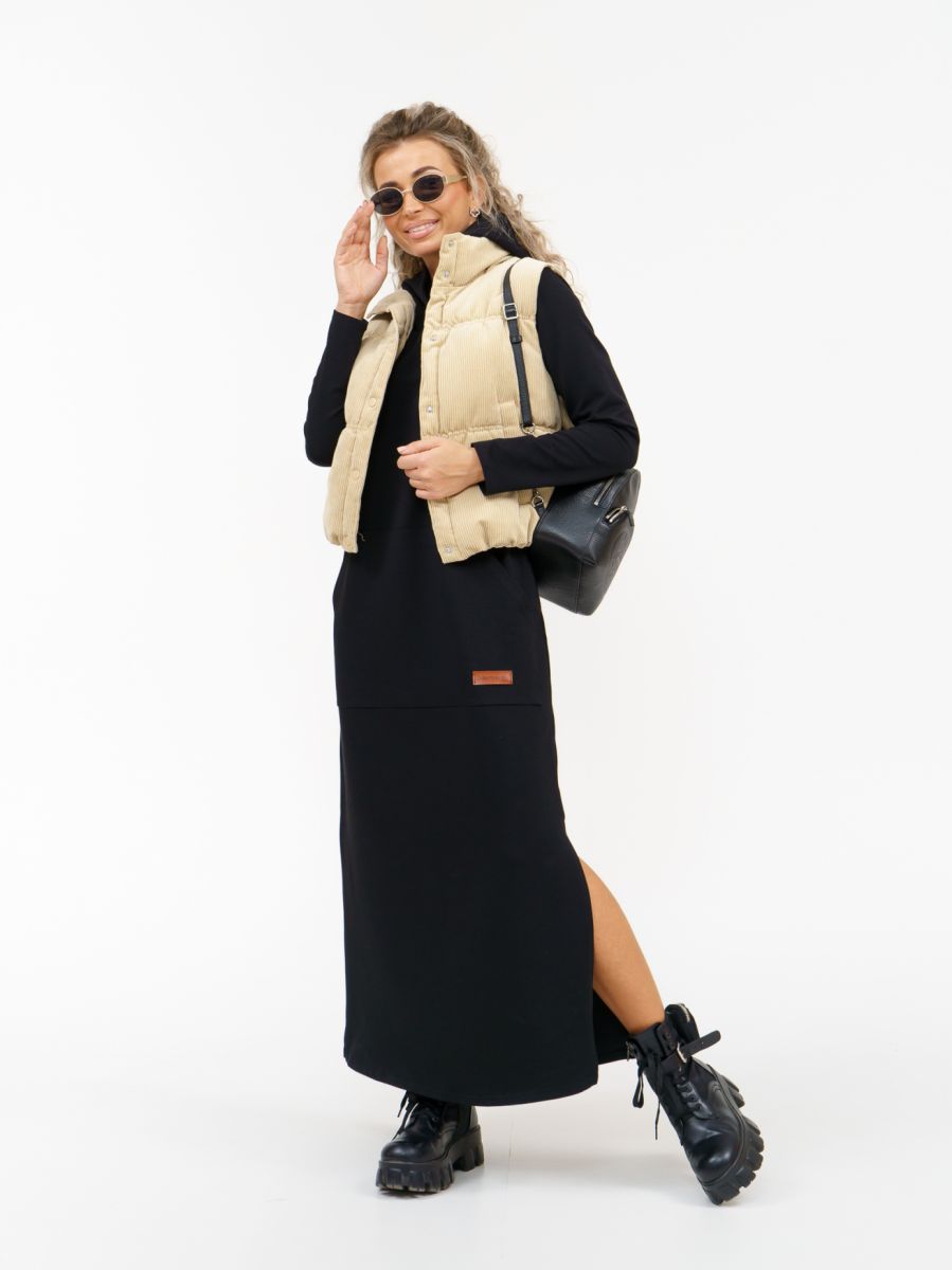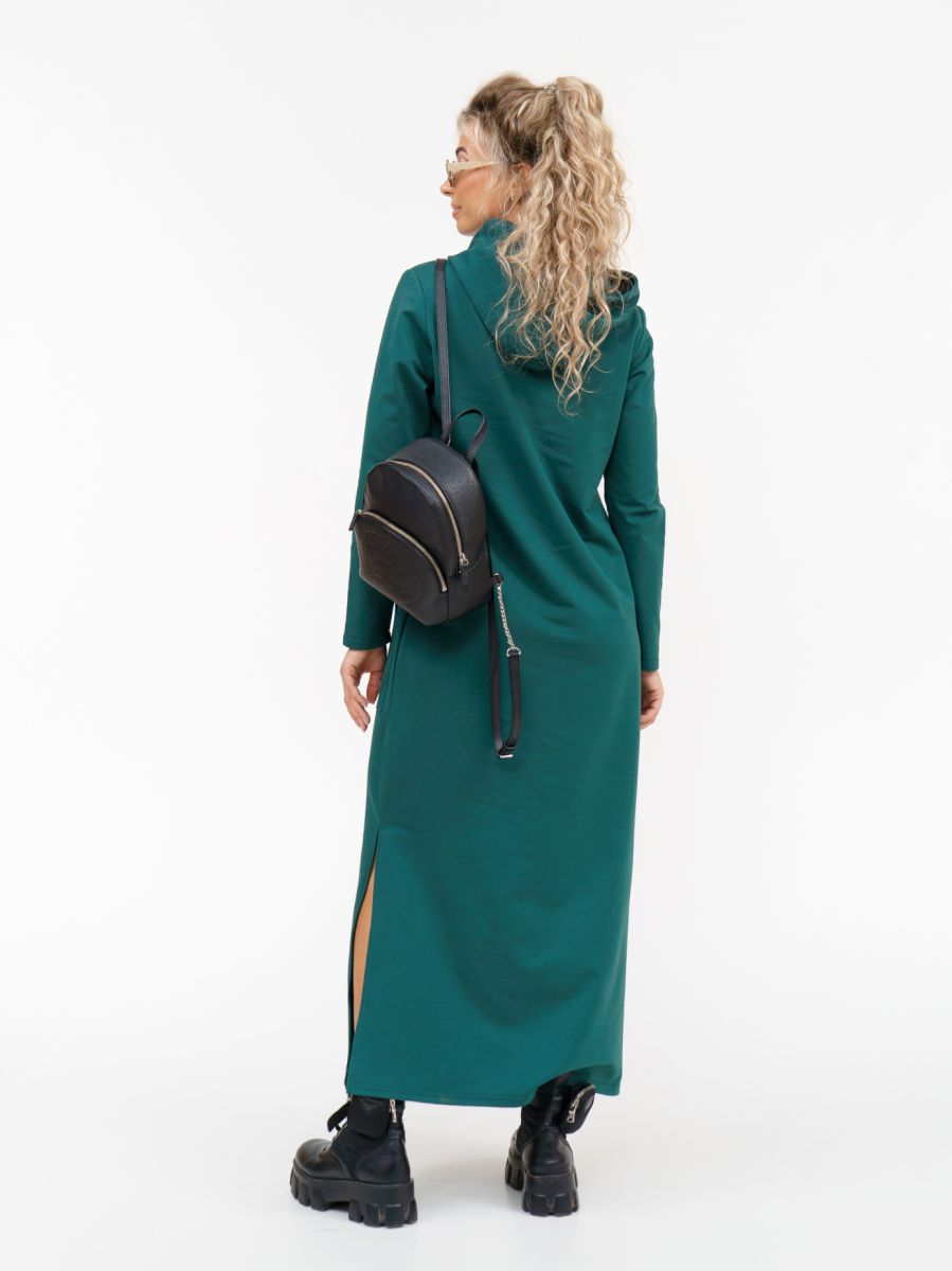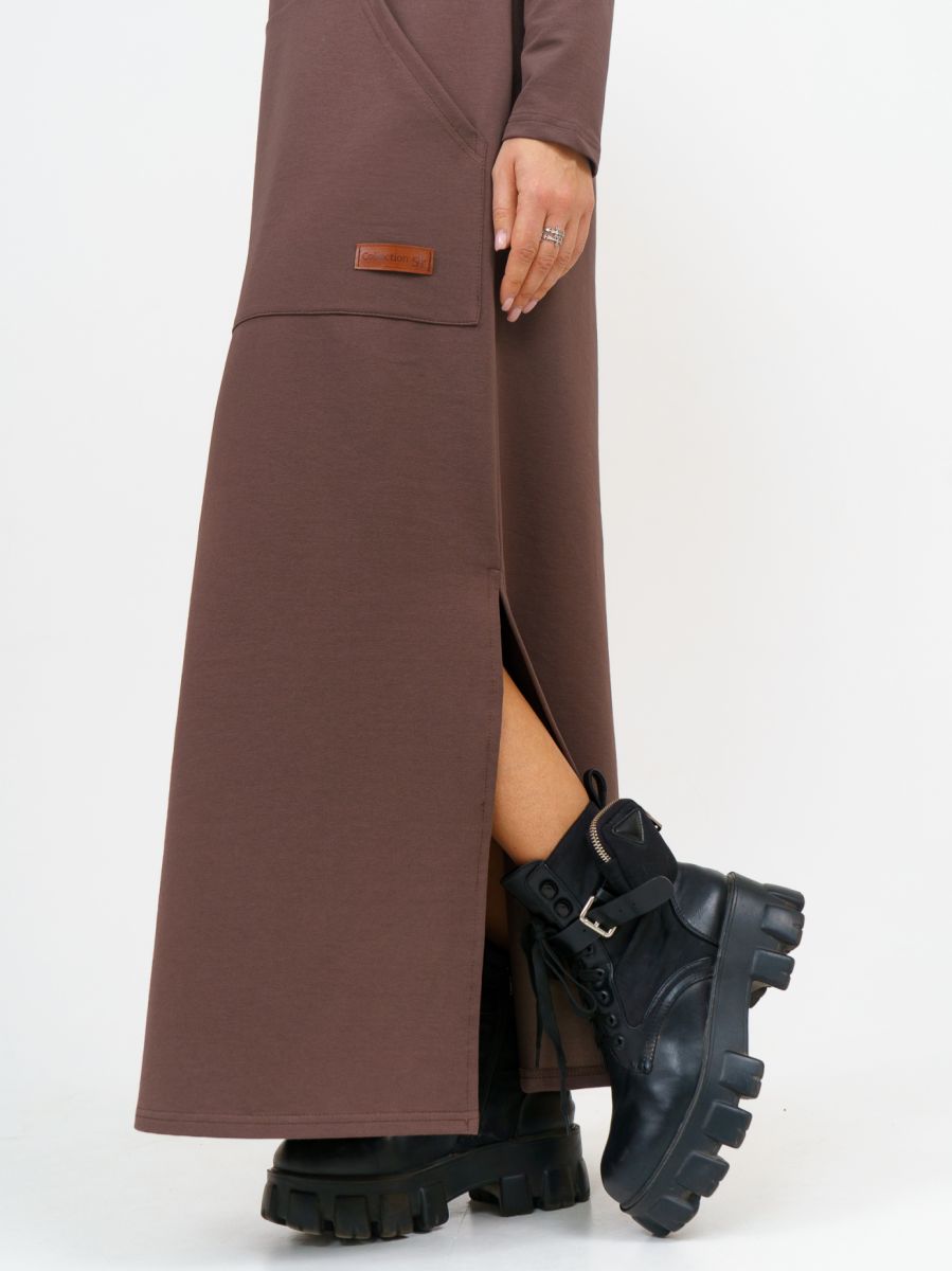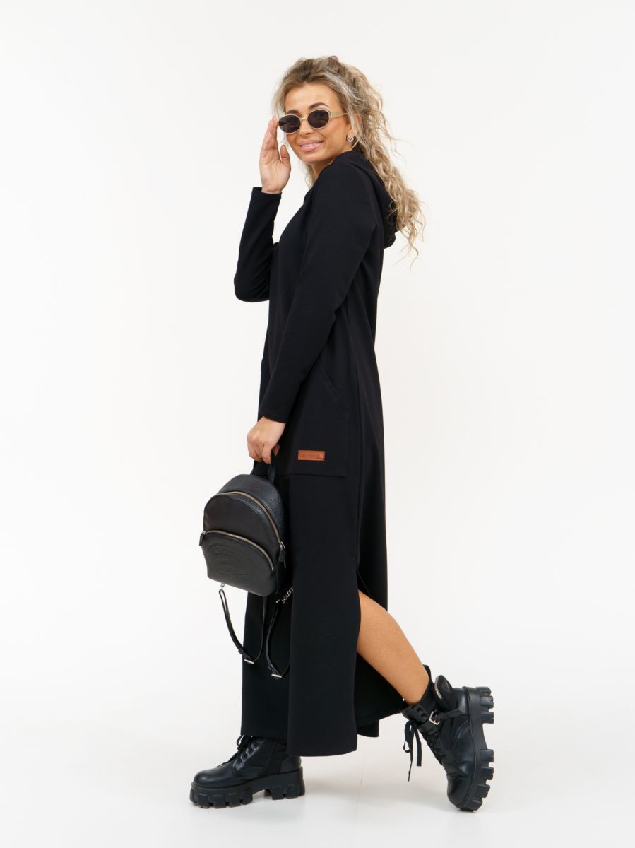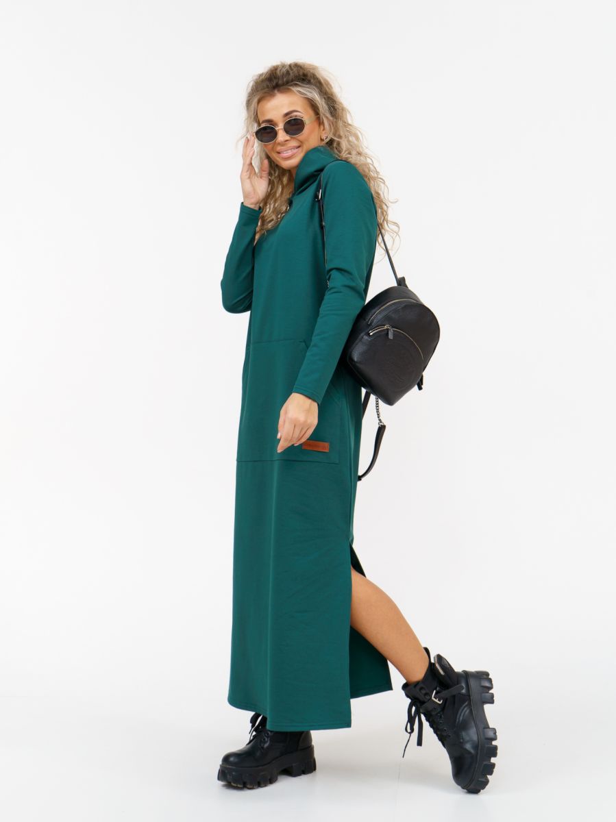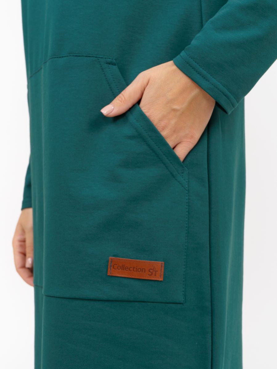 Длинное платье прямого силуэта с капюшоном и накладным карманом "кенгуру".