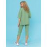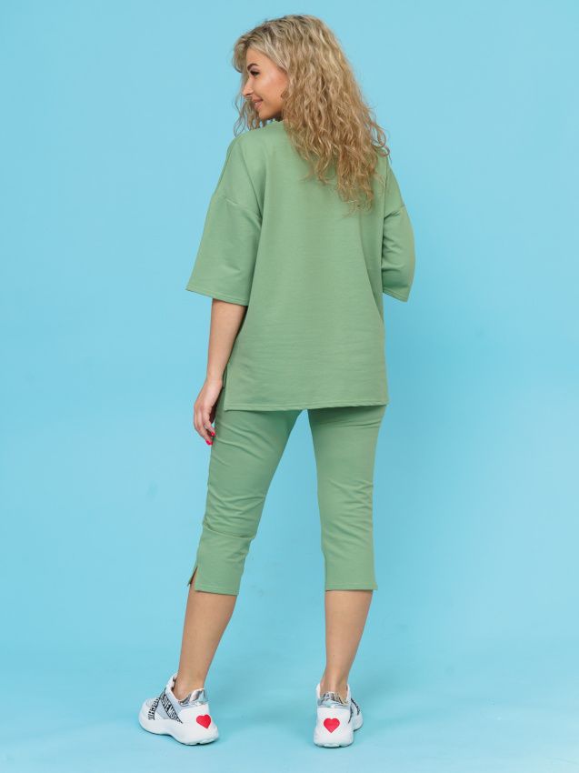 Комплект выполнен из высококачественного дышащего хлопка, приятный к телу. Джемпер прямого силуэта, со спущенной линией плеча и прямым коротким рукавом. Горловина и низ переда на притачной планке, по бокам разрезы с перепадом длины на спинку. Бриджи прямые с наклонными карманами и разрезами по бокам. Пояс на резинке. Перед джемпера слева декорирован шевроном. Оба изделия отличаются своей функциональностью и их можно с легкостью комбинировать по раздельности с различными вещами и обувью Вашего гардероба.