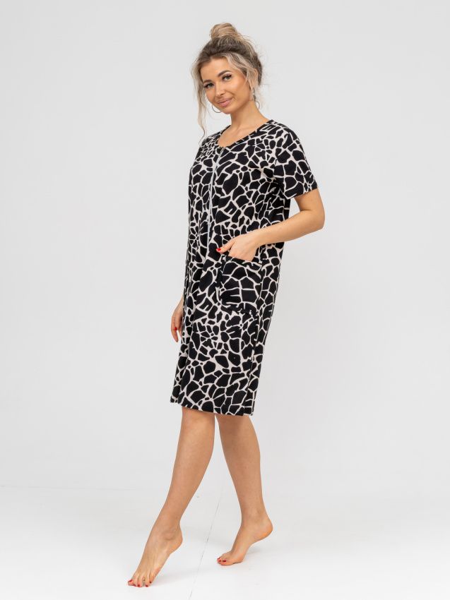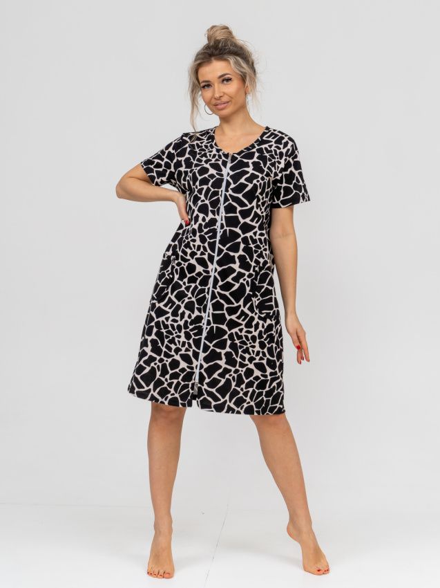 Женский халатик модных трендовых расцветок выполнен из 100% хлопчатобумажной ткани, что обеспечивает максимальный комфорт при ношении. Отличается мягкостью и приятной на ощупь текстурой.