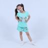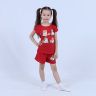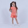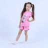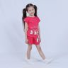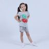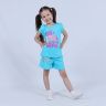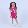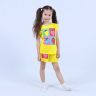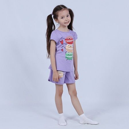 Костюм для девочки, состоящий из футболки и шорт. Выполнен из хлопкового полотна и оформлен печатным принтом. Футболка с округлым вырезом горловины, боковые швы шорт с закругленными.
