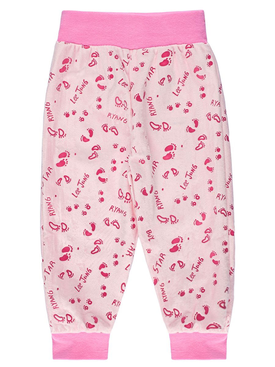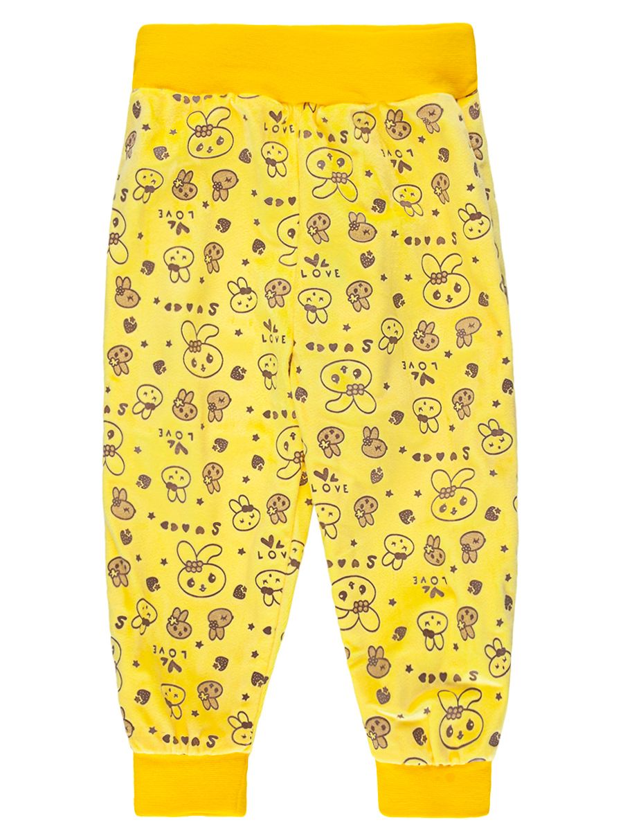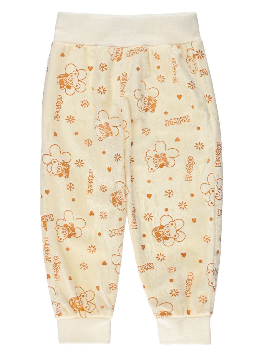 Штанишки для малышей из набивного трикотажного полотна, на широком эластичном поясе и манжетах.