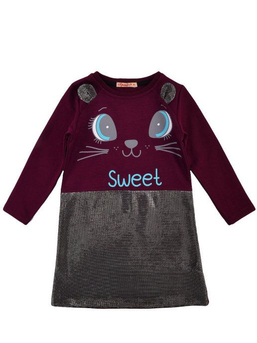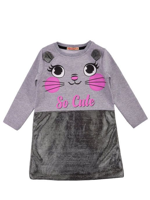 Платье для девочек с длинным рукавом из комбинированной ткани верх однотонный с большим принтом виде "мордочки животных"