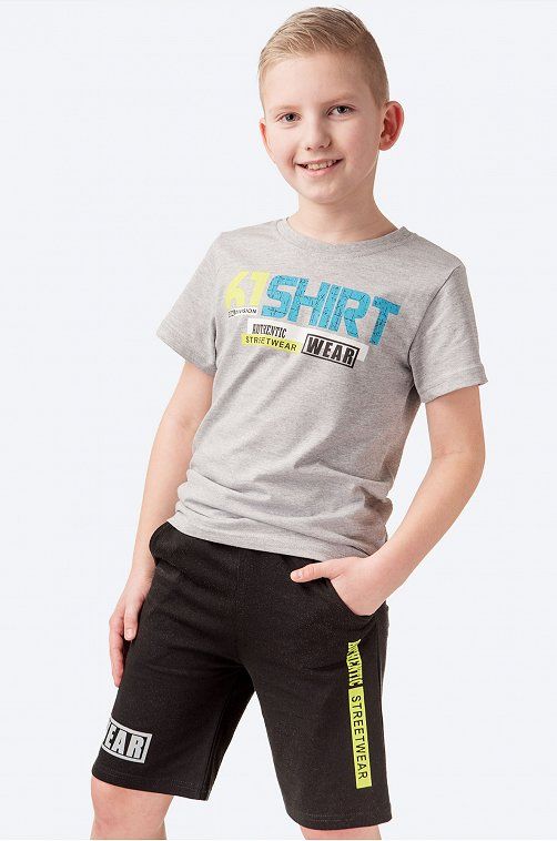 Комплект для мальчика от 8 до 12 лет. Модель состоит из футболки с округлым вырезом горловины и шорт на широкой резинке. Материал ткани хлопковое полотно ярких цветов с печатным принтом. Цвета в ассортименте.