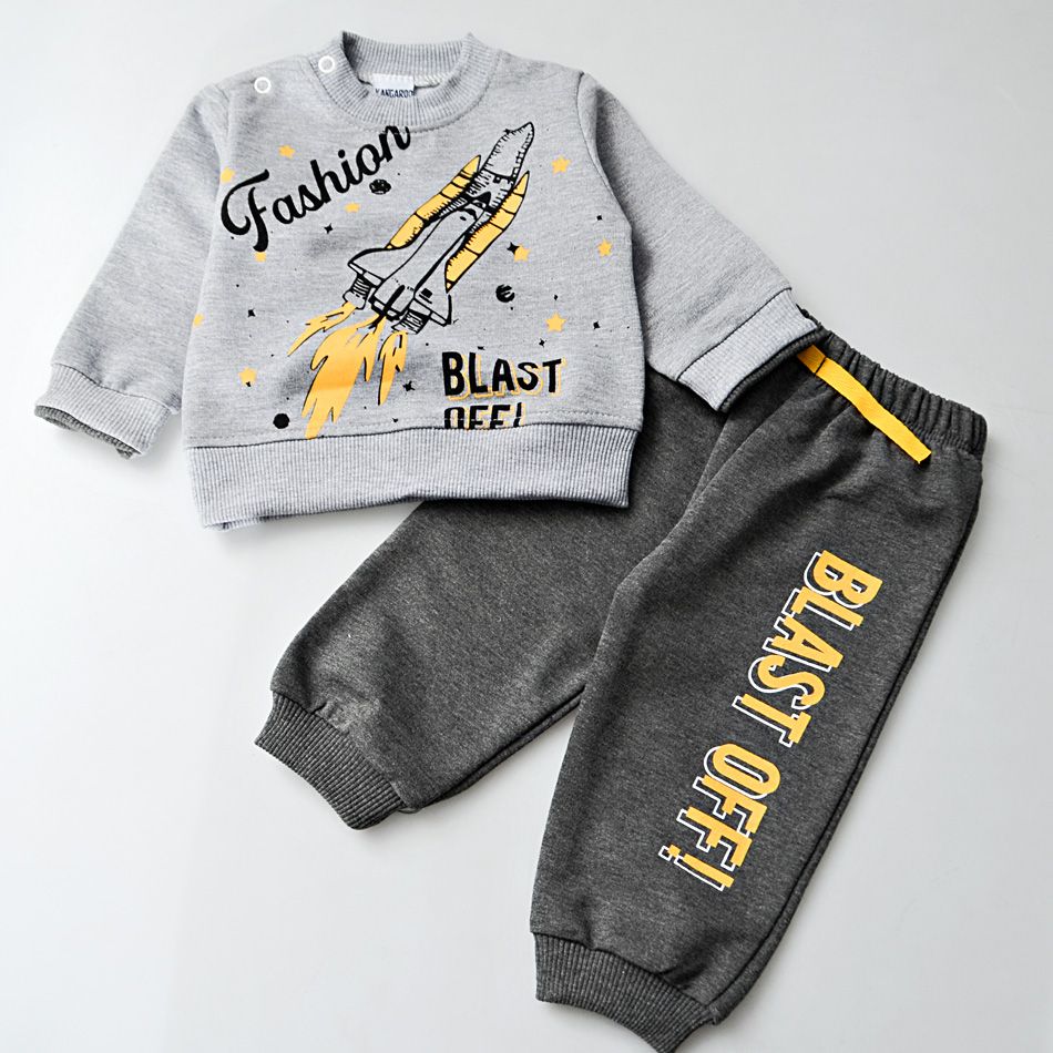 Декорирован принтом в виде ракеты на груди и надписи на брюках