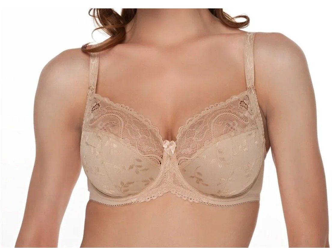 Бюстгальтер с мягкими чашками с тройным членением и боковой поддерживающей деталью. На каркасах. Выполнен из эластичного полотна с набивным рисунком, эластичного кружева.