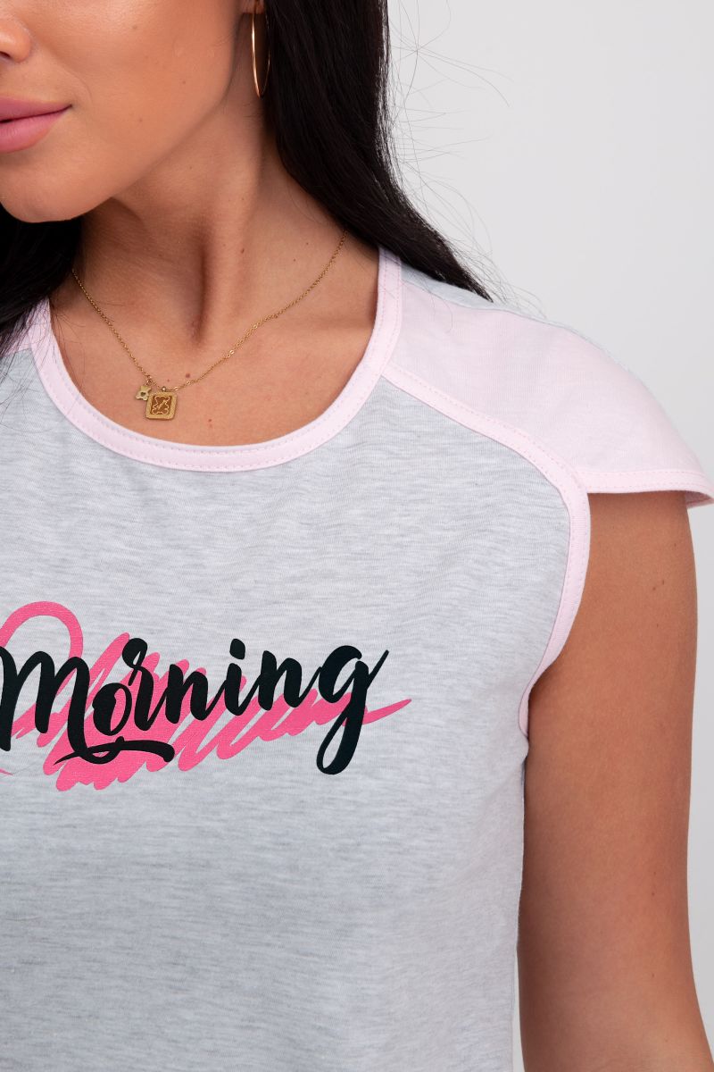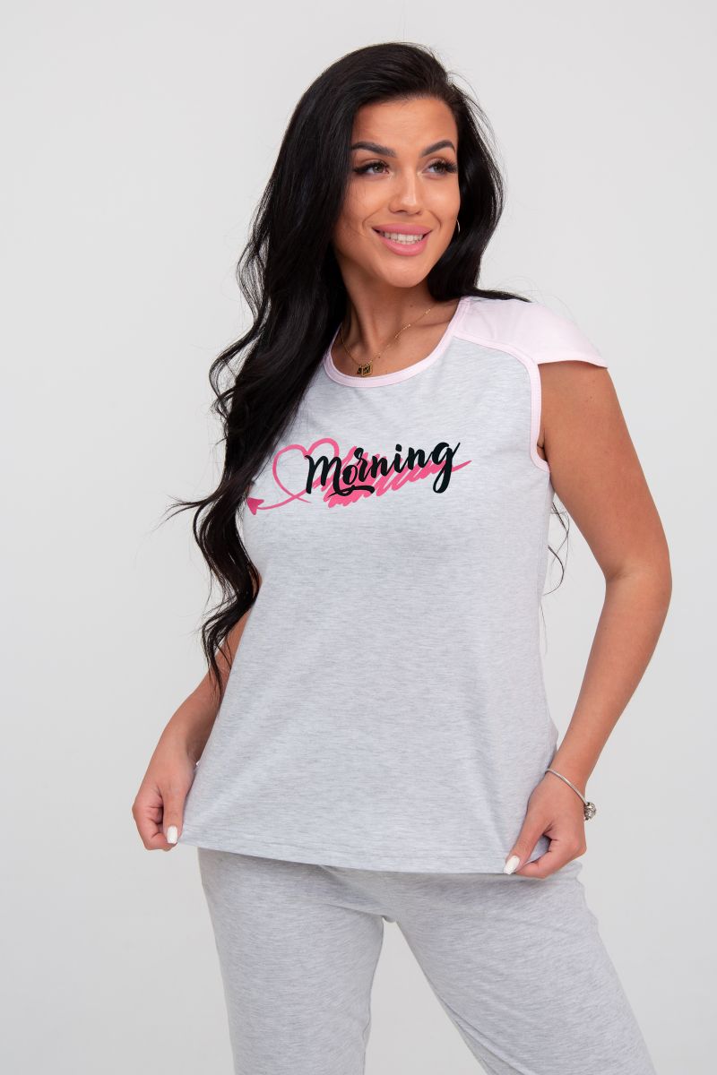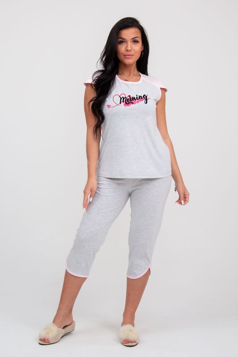 Пижама женская из кулирки. Футболка со спущенной проймой, бриджи жлиной чуть ниже колена. Дизайнерский принт