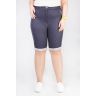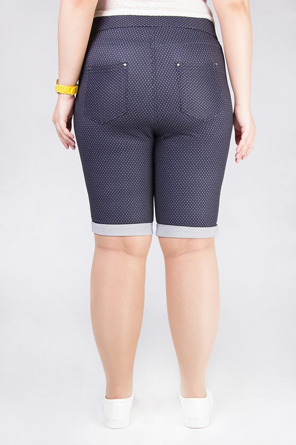 Джинсовые бермуды с лампасами. Детали: спереди застежка на молнию и пуговицу, в пояс вставлена резина, сзади под фигурной кокеткой накладные карманы закрепленные хольнитенам, по линии низа отворот.