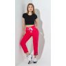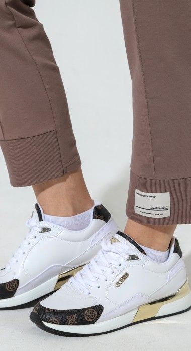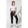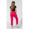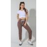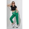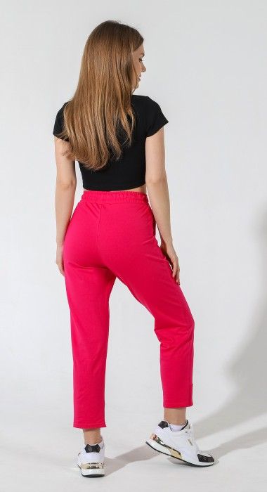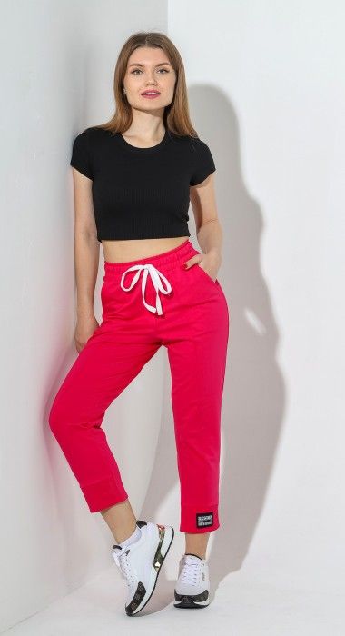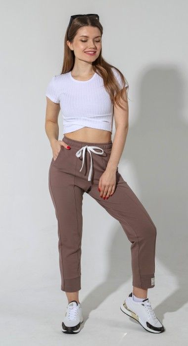 Брюки из трикотажного полотна футер-двунитка, на притачном поясе с эластичной тесьмой внутри и карманами в боковых швах. Передние половины – разрезные по линиям центра. По швам стачивания настрочены отделочные строчки. В нижних частях передних половин – отделочные детали из полотна «кашкорсе» в цвет основного материала. На левой отделочной детали настрочен декоративный элемент прямоугольной формы. Средний шов передней половины – с имитацией застежки.