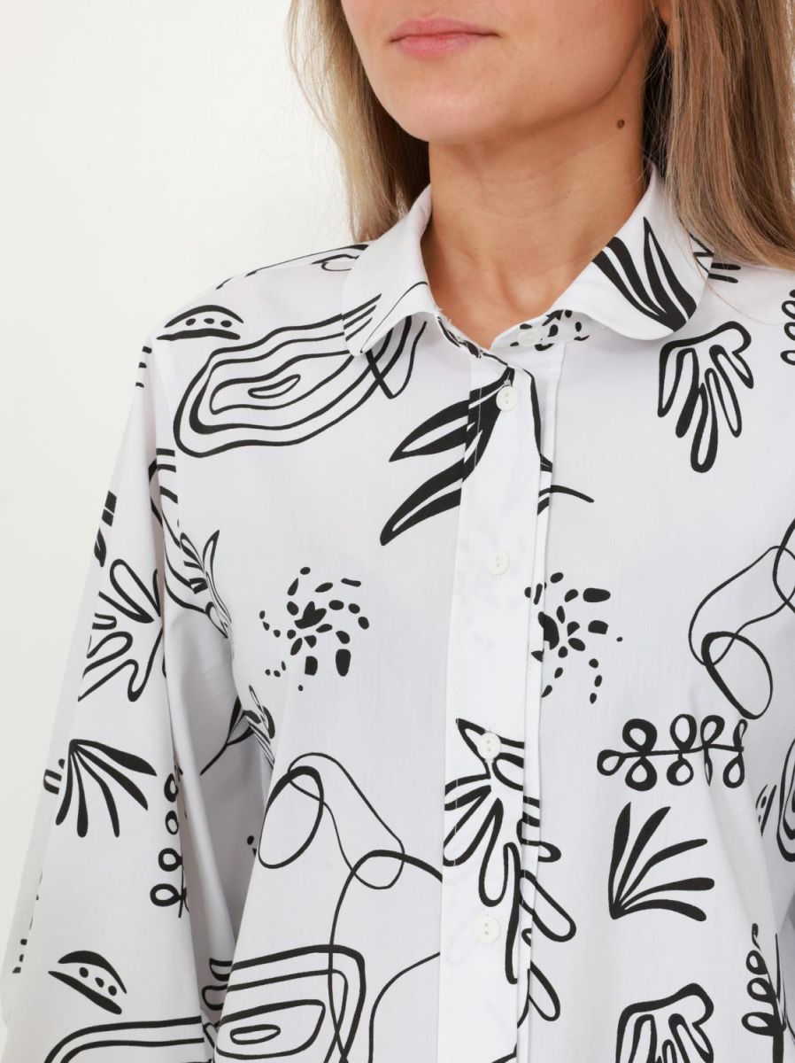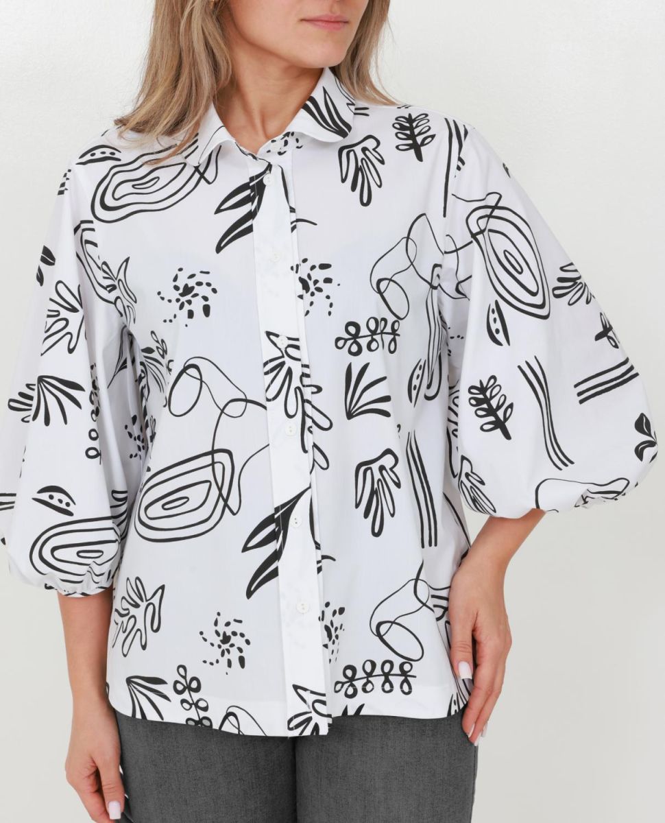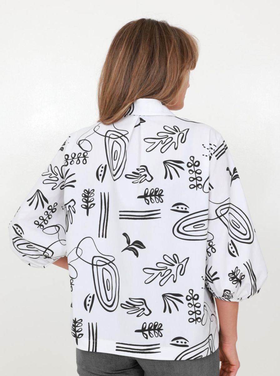 Блуза прямого силуэта. Круглый отложной воротник на стойке. Застежка супатная на пуговицы. Спущенное плечо. Рукава широкие со сборкой по низу. Рукав окантован. Низ фигурный. По спинке от воротника встречная складка.
