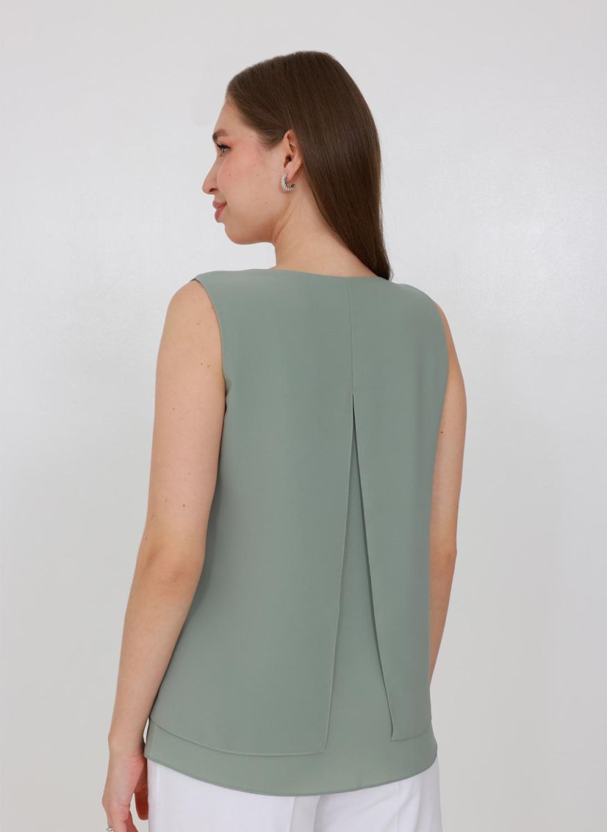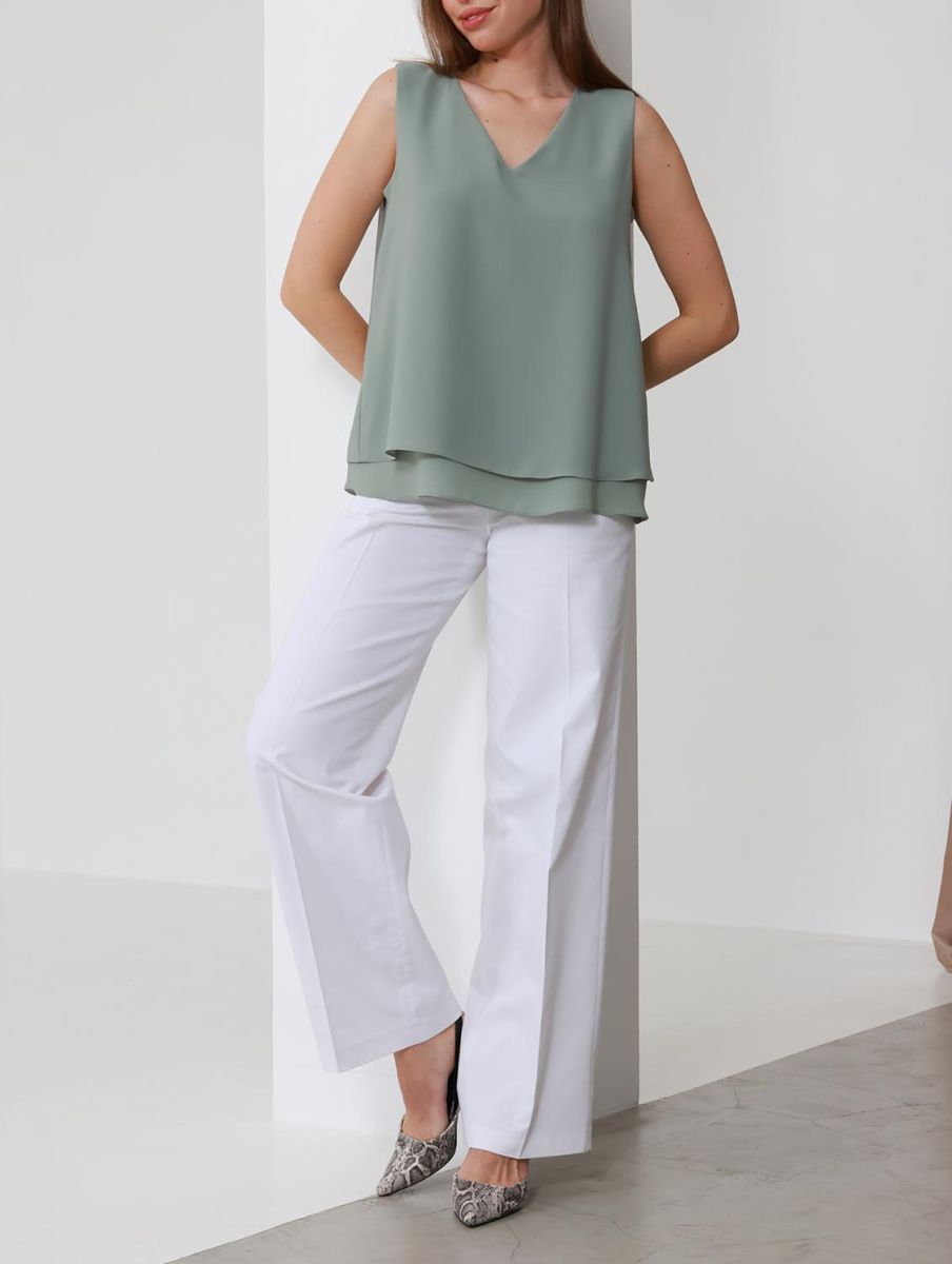 Силуэт трапеция. Спереди V-образный вырез. Верхняя блуза короче нижней. Спинка со швом, переходящий в разрез.