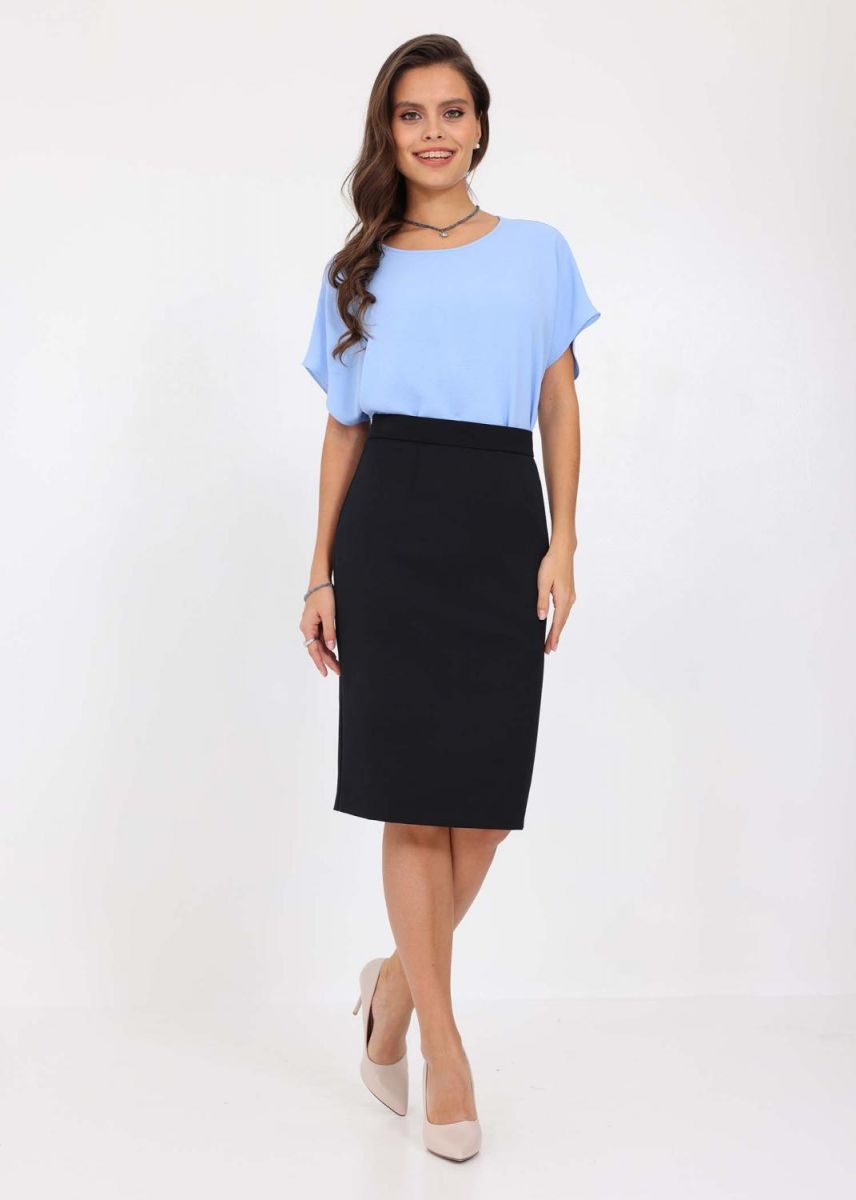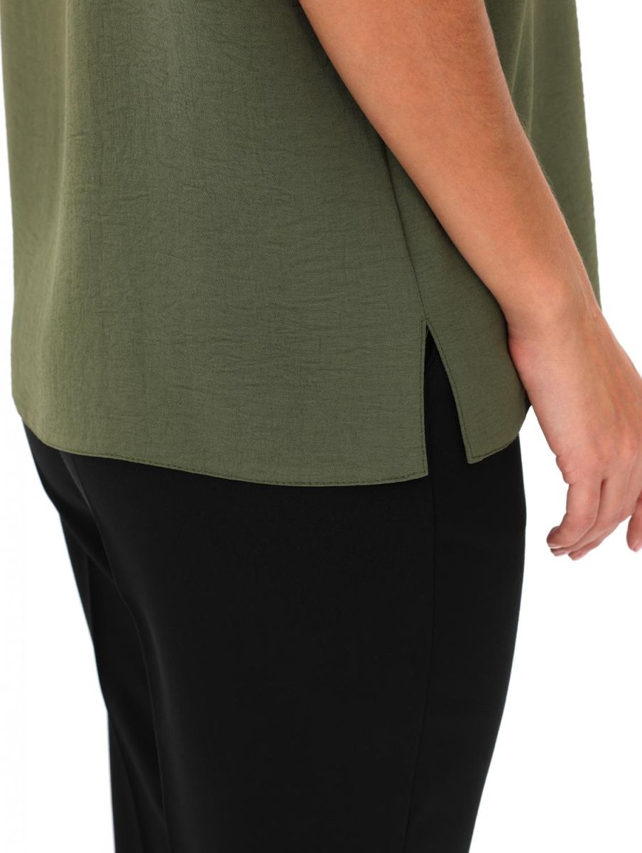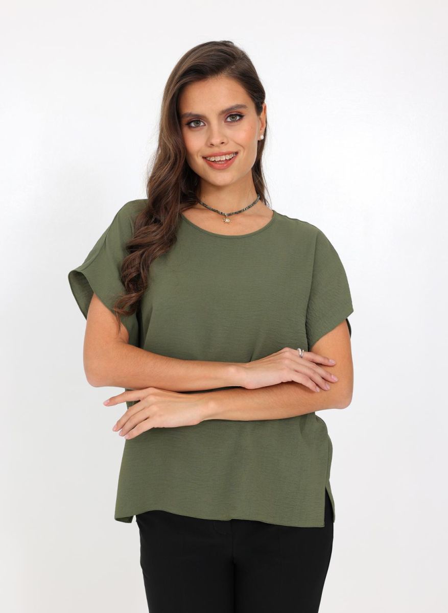 Прямая блуза с круглым вырезом и короткими рукавами сочетает удобство футболки. Завязка и разрезы по бокам – функциональные детали.