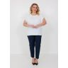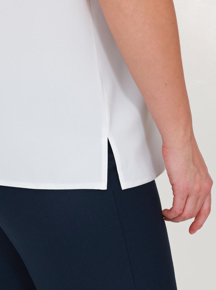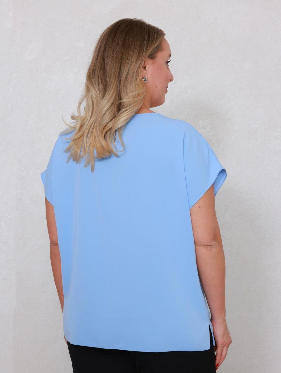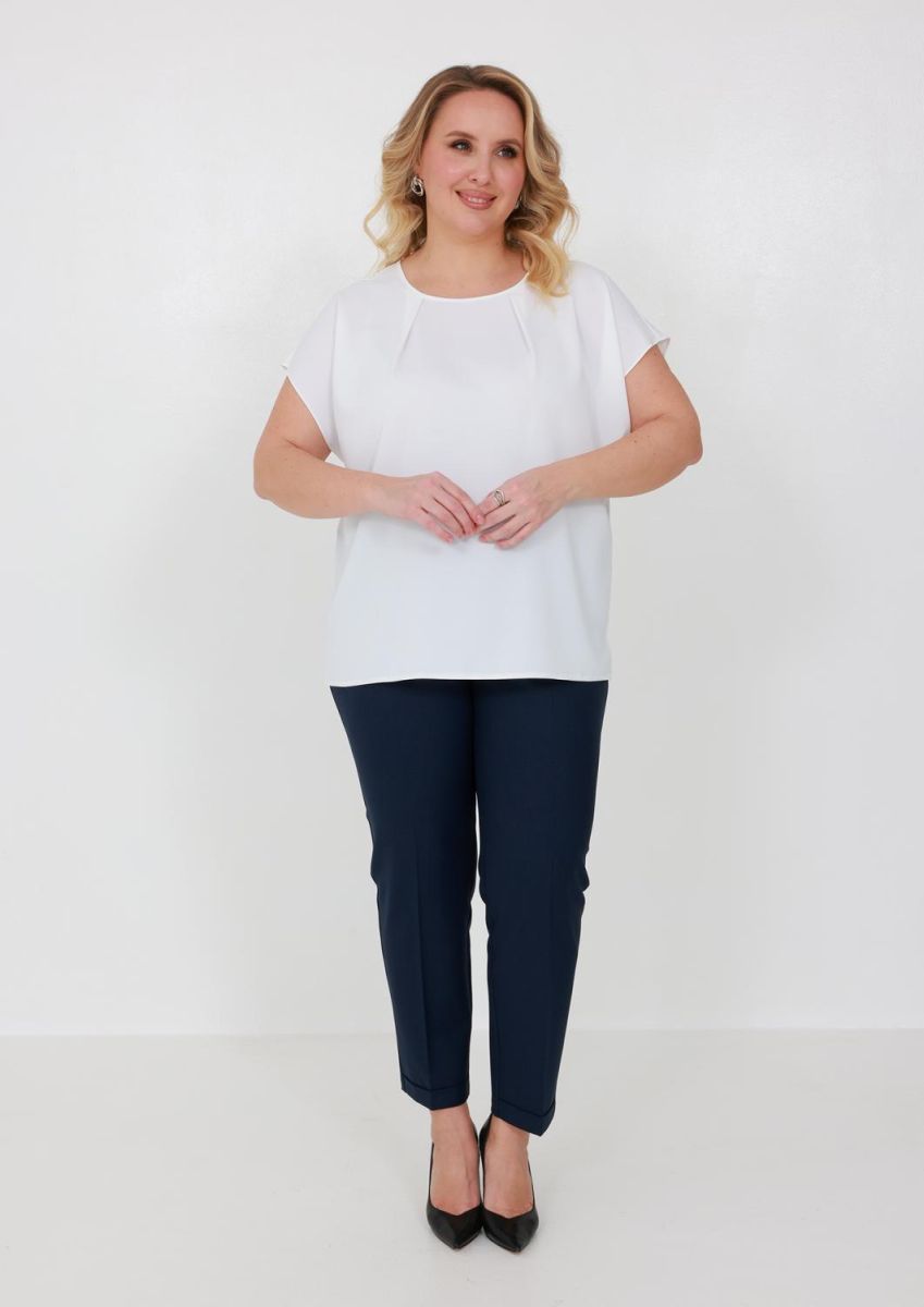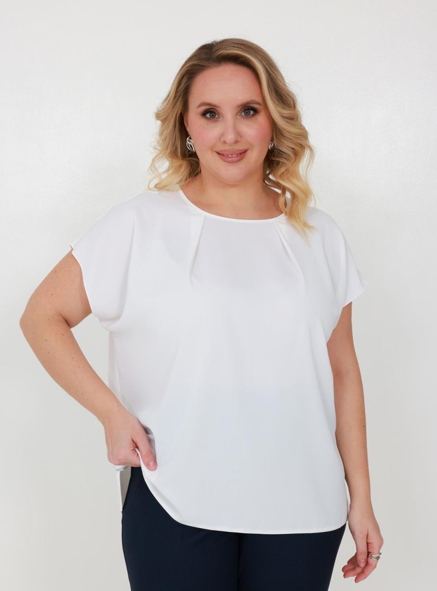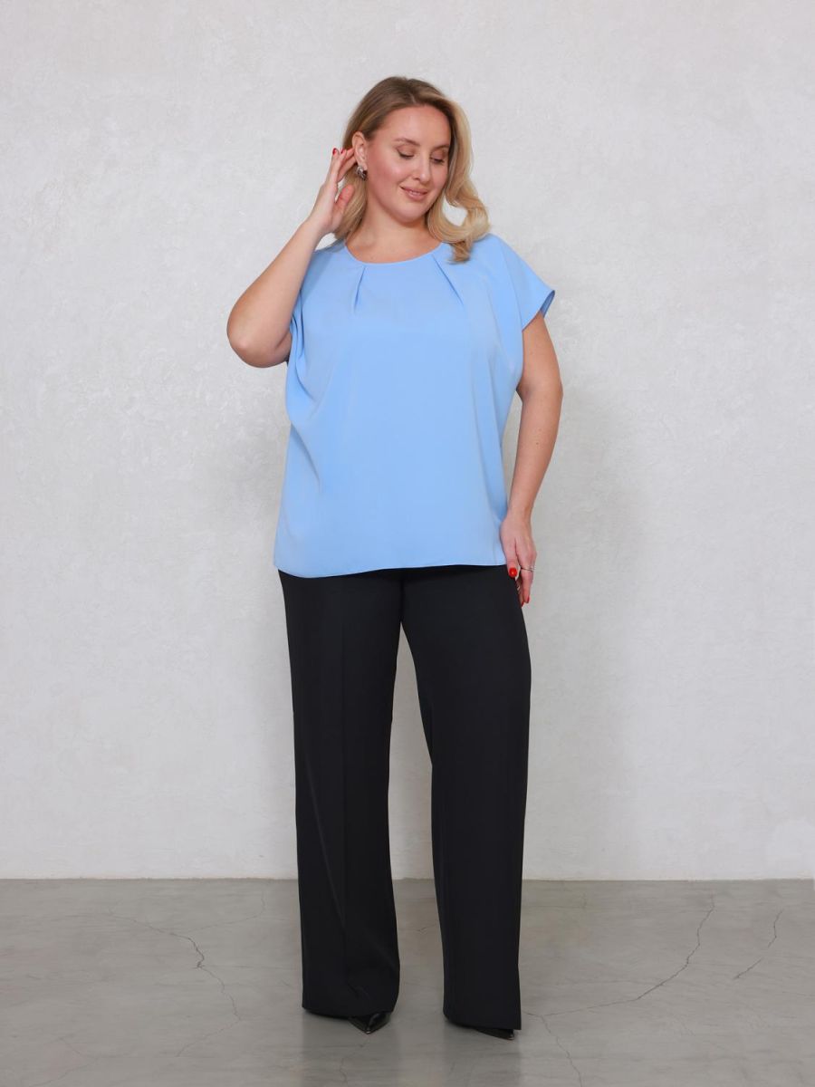 Свободная модель прямого кроя с коротким рукавом и круглым вырезом подойдёт к любому базовому низу. Сзади под застёжкой имеется аккуратный вырез-капля. На передней половинке складки по горловине. По боковым швам разрезы. Блуза изготовлена без подкладки.