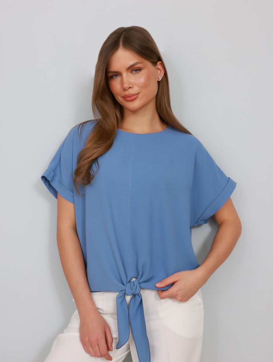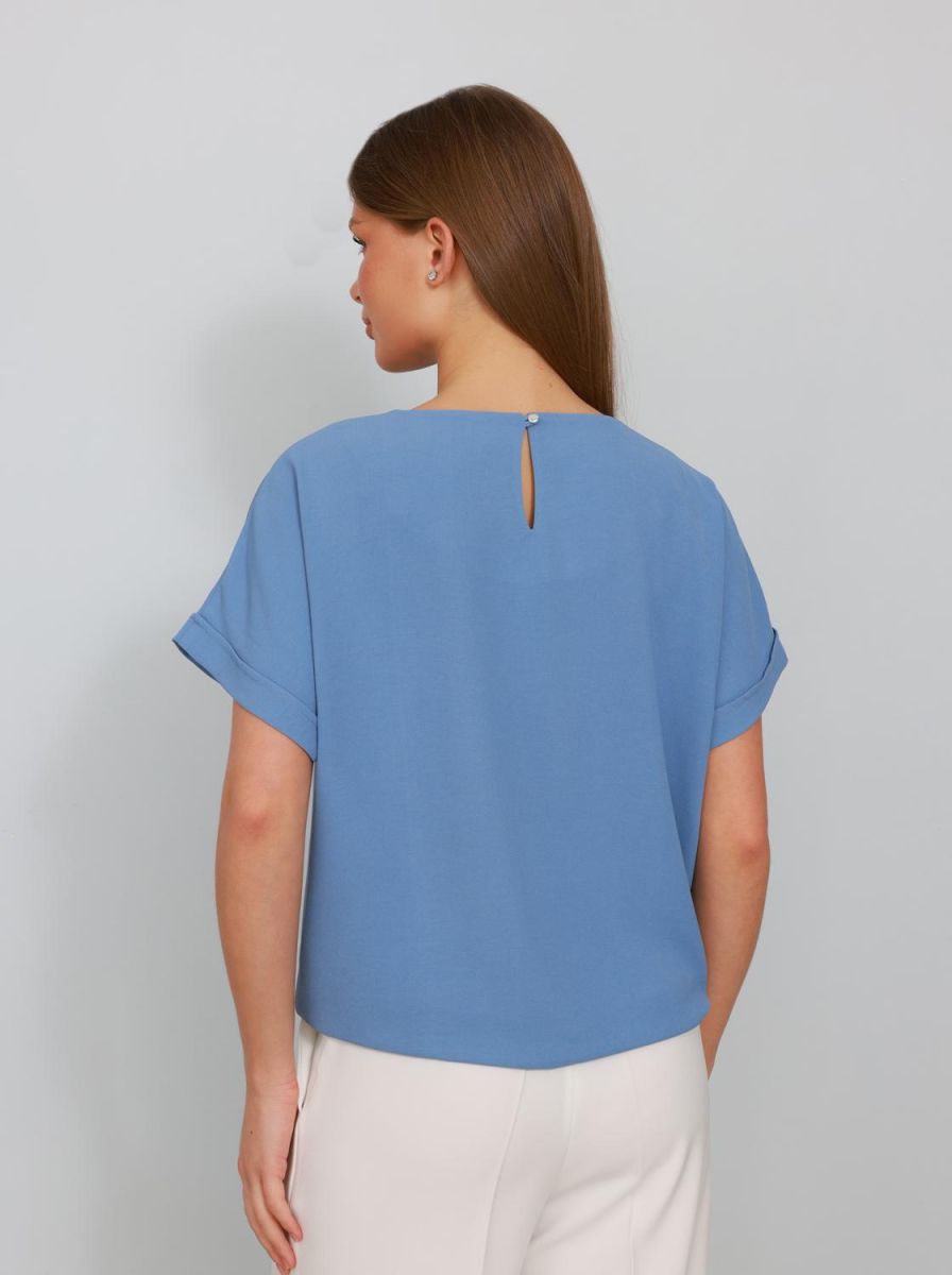 Блуза с цельнокроенным рукавом. Полочка со швом по середине, с переходом на завязку. По спинке капля с застежкой на навесную петлю и пуговицу. По низу рукава имитация манжеты.