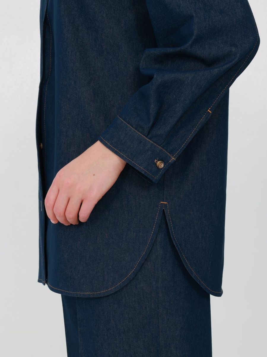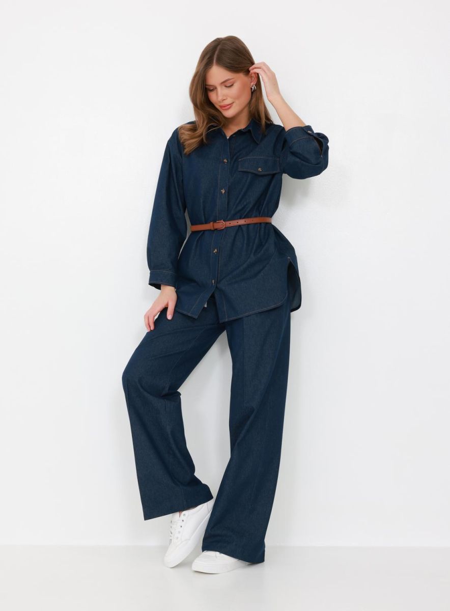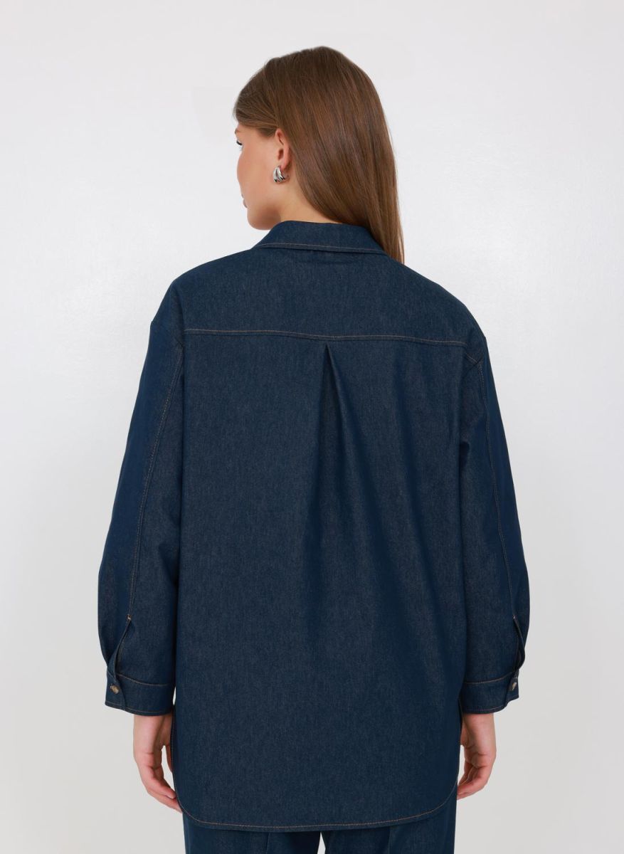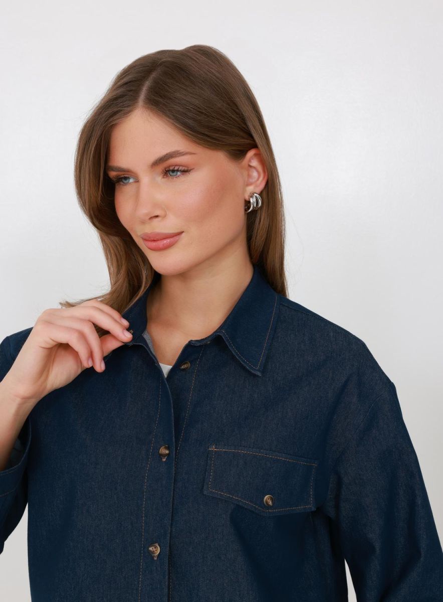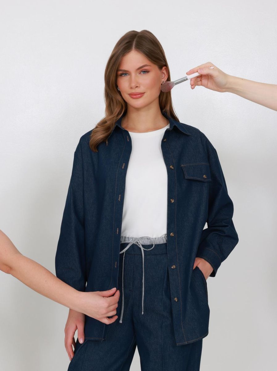 Рубашка прямого силуэта. Полочка с отделочными клапанами. Спинка с кокеткой, по центру складка. Воротник рубашечного типа. Рукава с локтевым швом. Понизу складка, с манжетой на застежку. Ремень в комплект не входит.