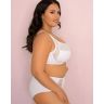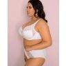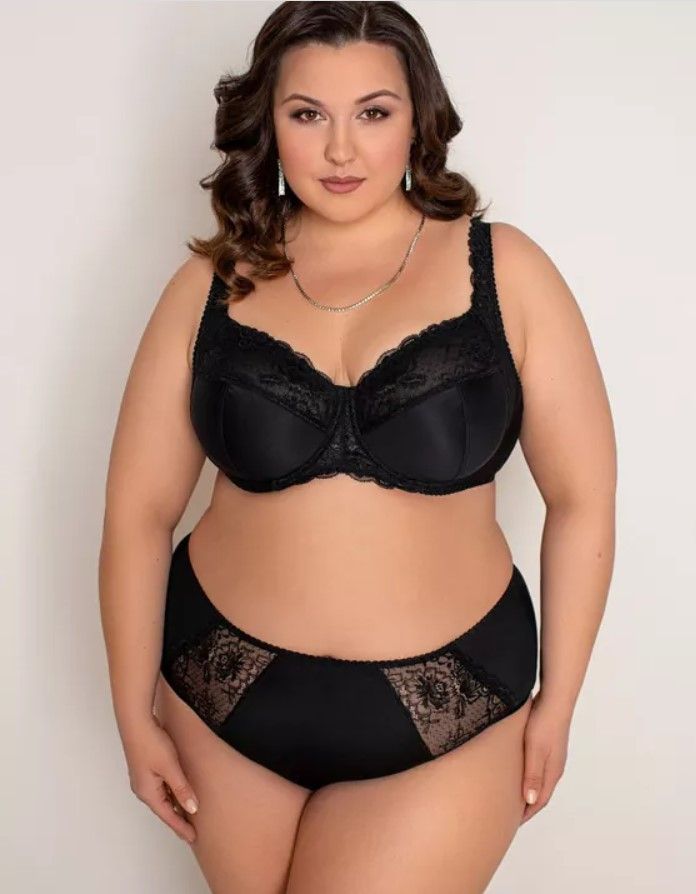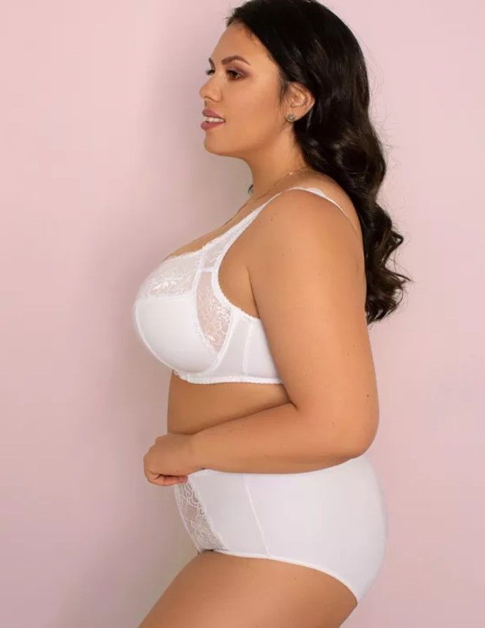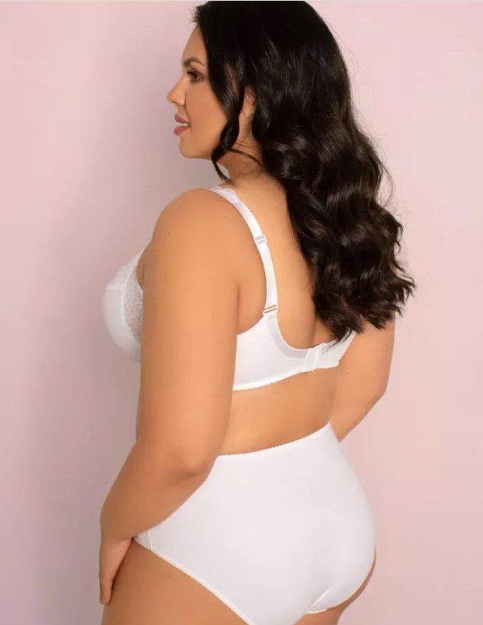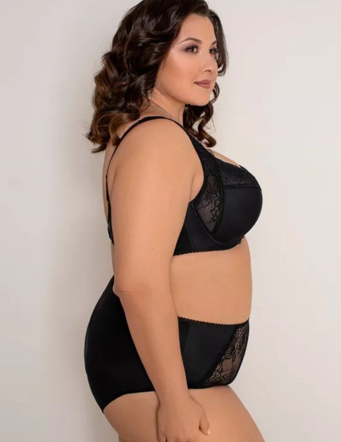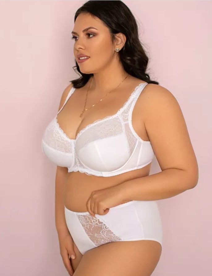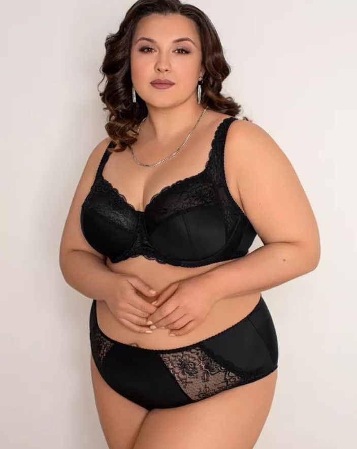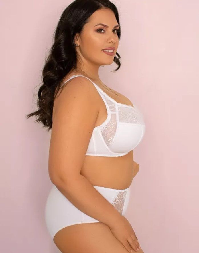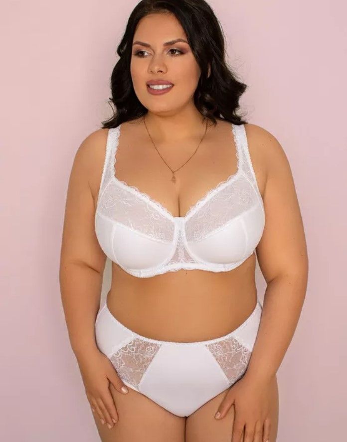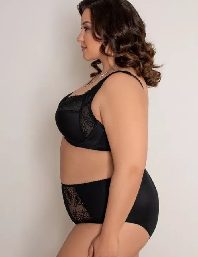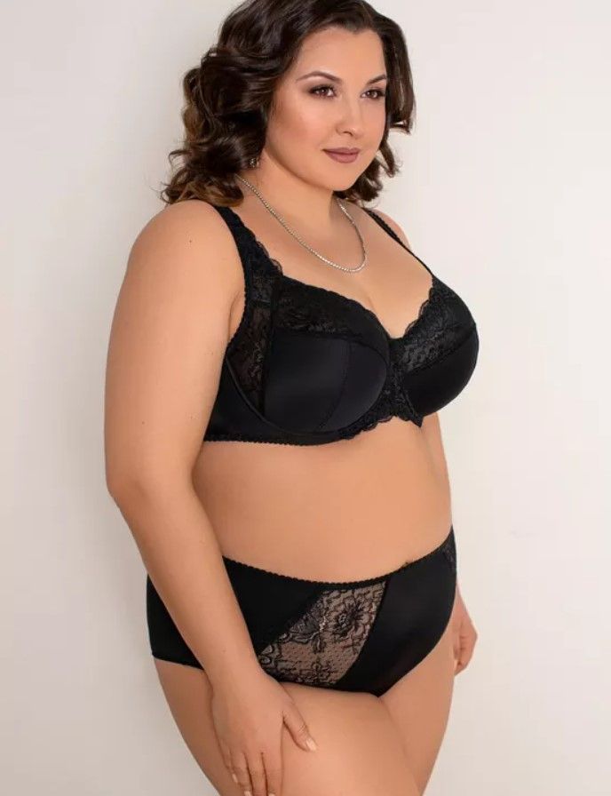 Мягкая чашка из неэластичного функционального трикотажного полотна, комбинированная эластичным кружевом. Бюстгальтер на каркасах, крой чашек и бретелей выполнен с учетом необходимости поддержки большой пышной груди, внутренняя подкладка чашек выполнена из хлопкового полотна.