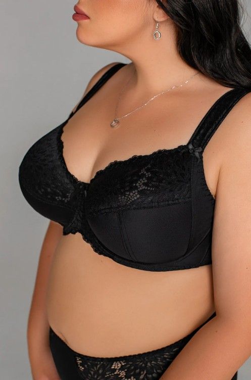 Мягкая чашка из эластичного кружева и не эластичного полотна, состоящего из 33% хлопка.На каркасах. Для повышения комфортности бретель дублирована поролоном.