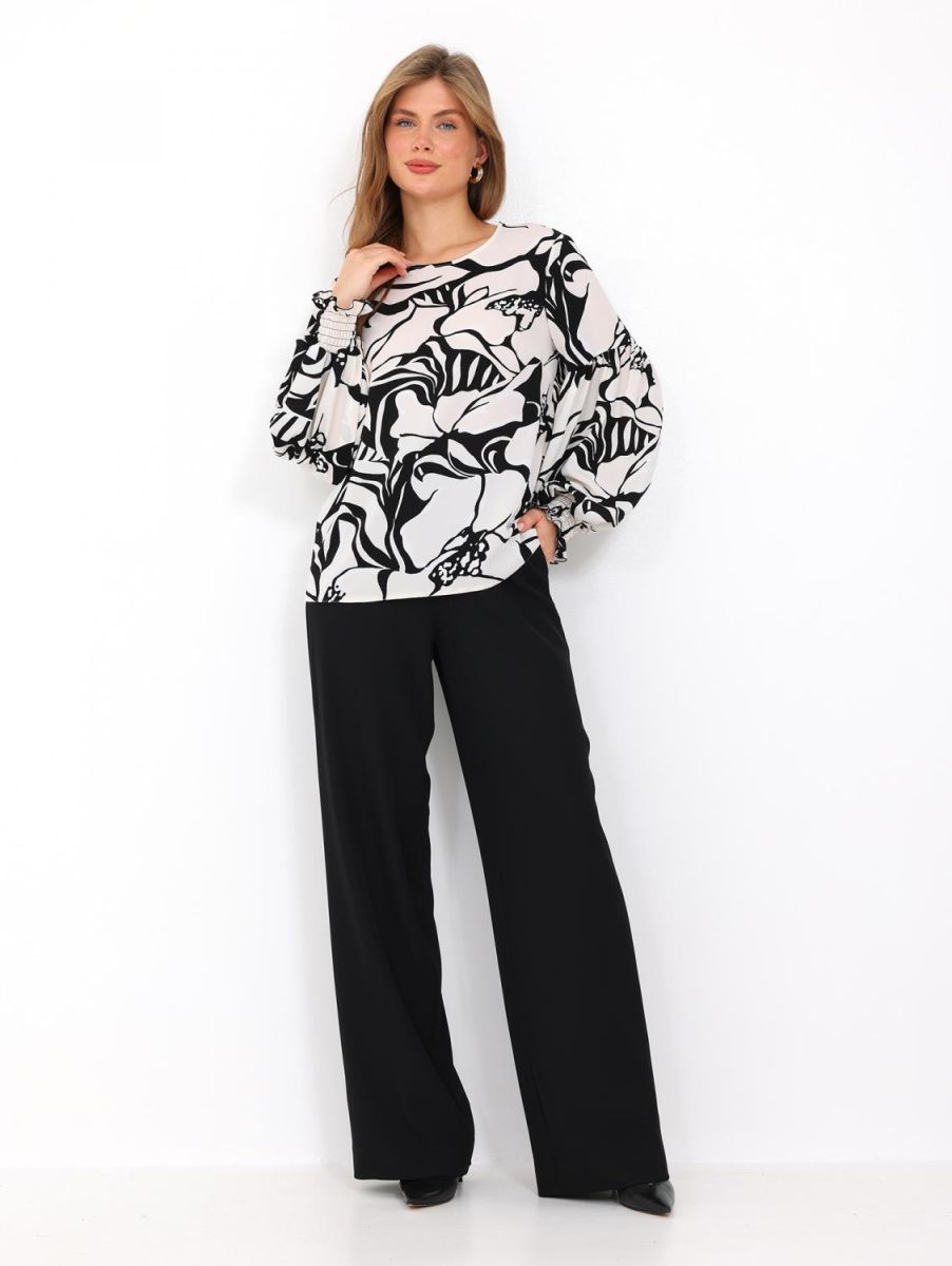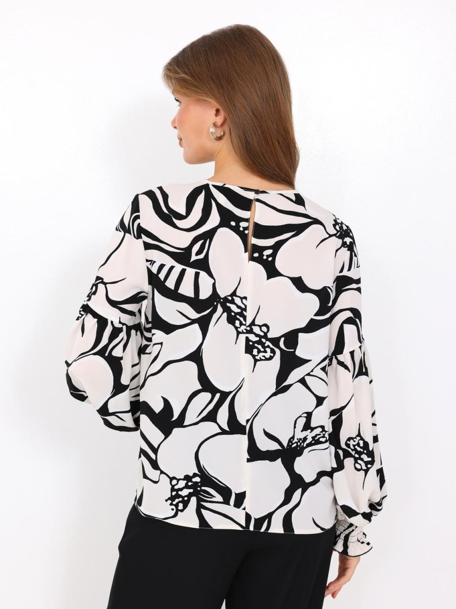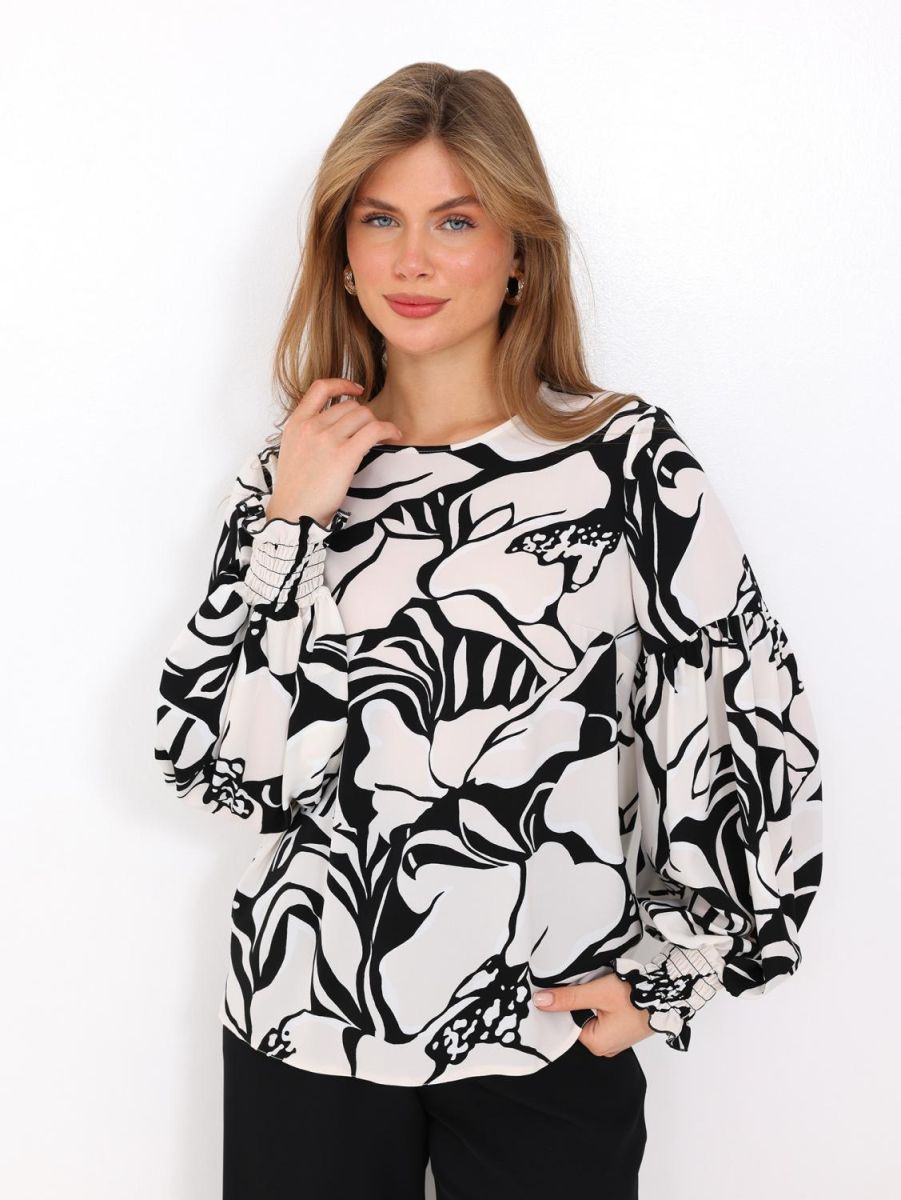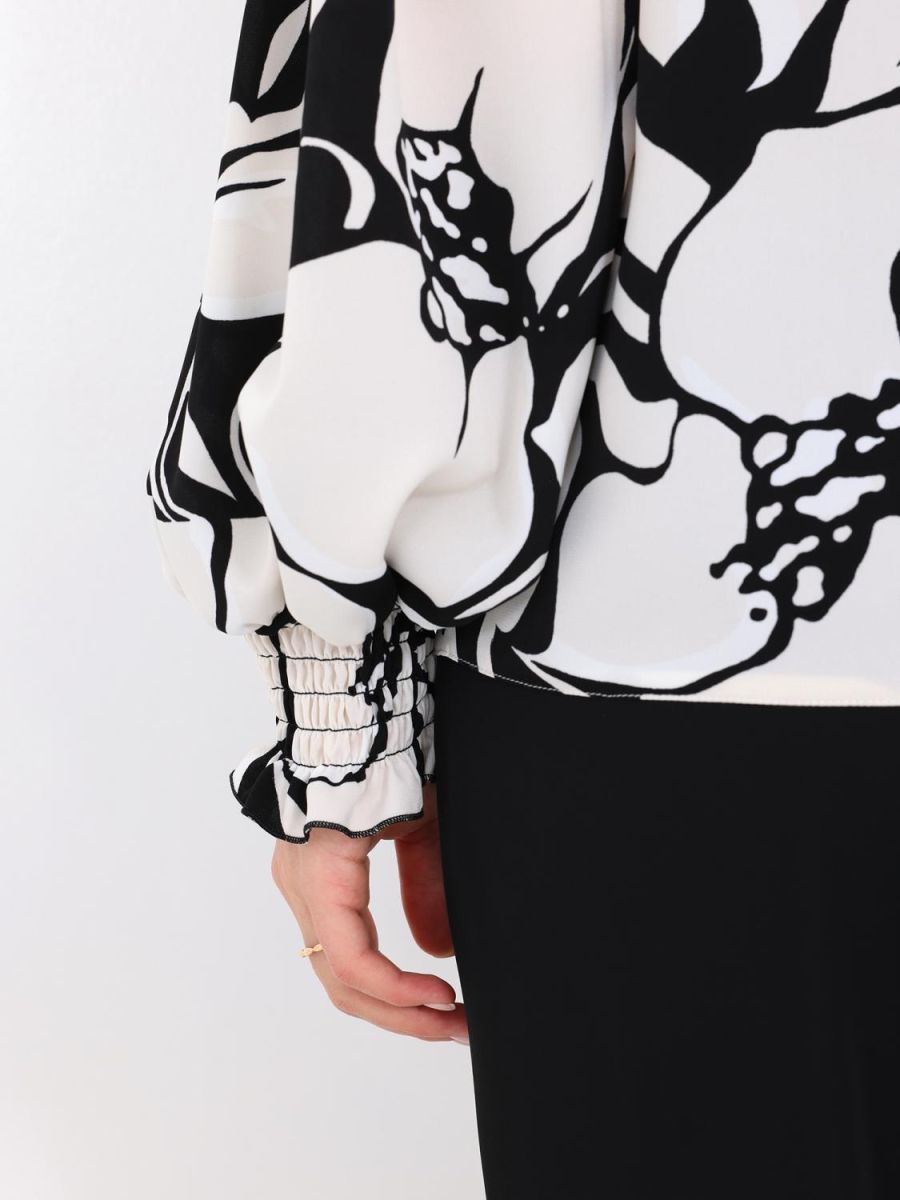Блуза прямого силуэта. Рукава втачные, со сборкой по подрезу и низу манжетой. Манжета собрана ниткой-резинкой с пятью строчками.