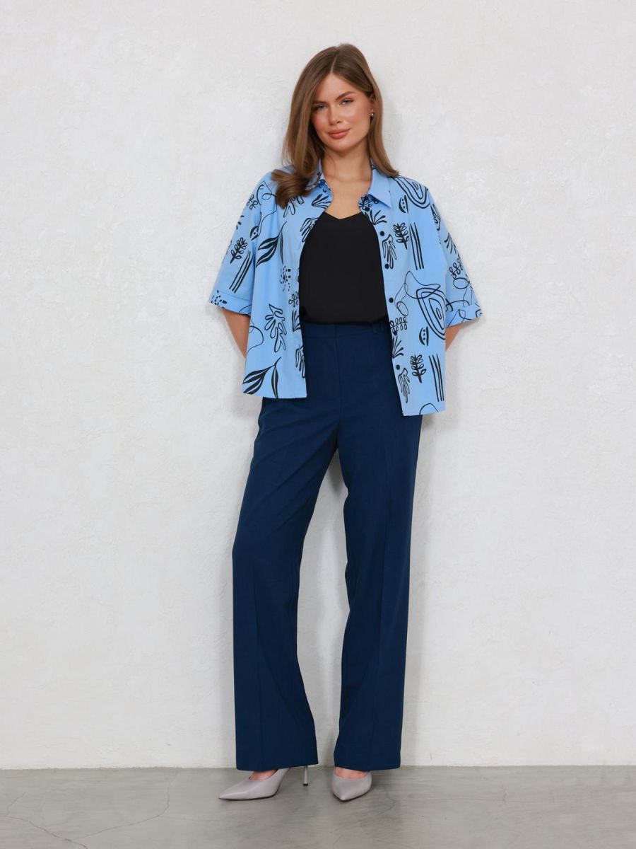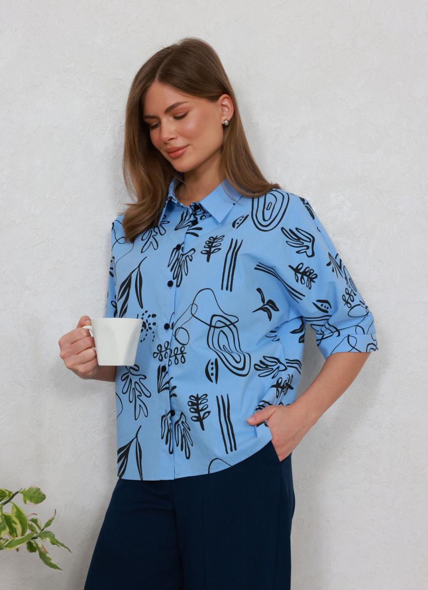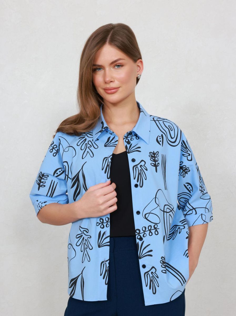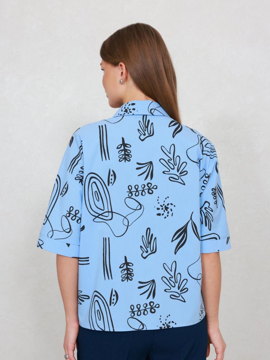 Рубашка прямого силуэта со спущенными плечами. Воротник отложной на стойке. Застежка на пуговицы. Рукав короткий с притачной манжетой.