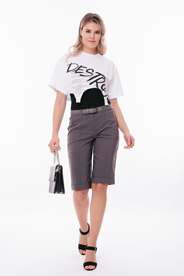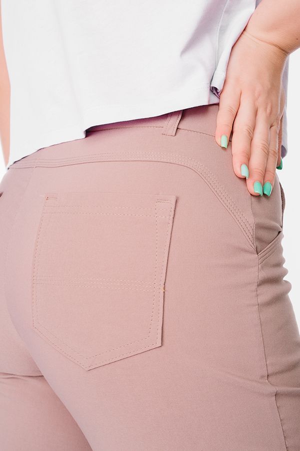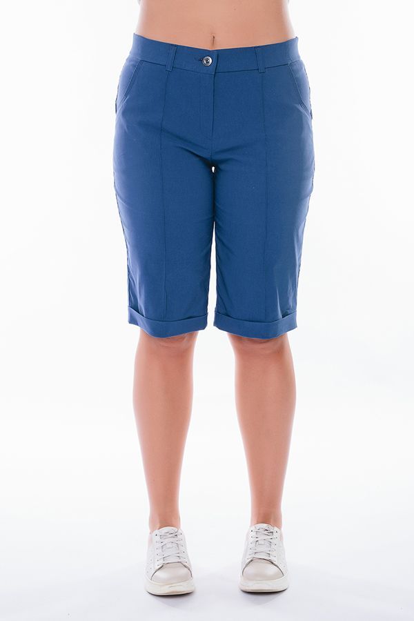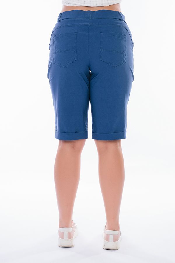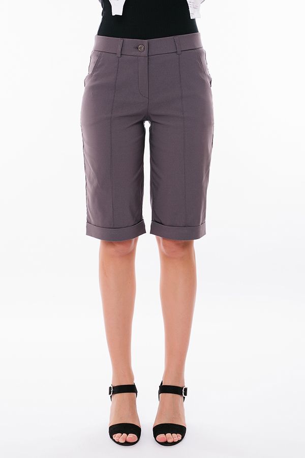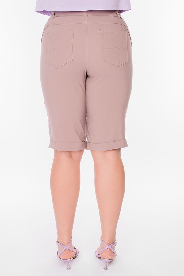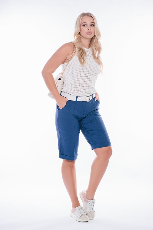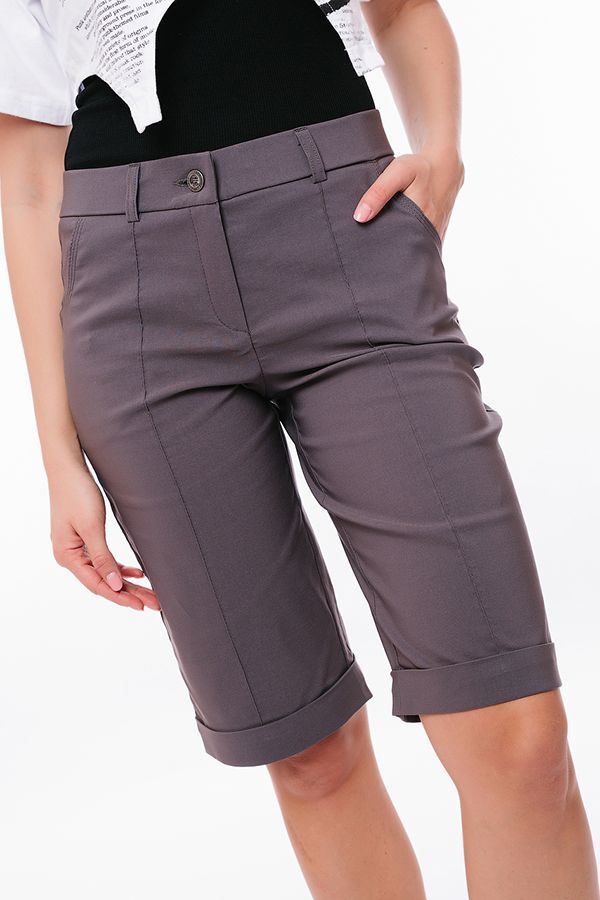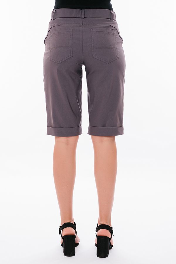 Бермуды с застроченной стрелкой в городском стиле. Детали: спереди застежка на молнию, боковые карманы, шлевки на поясе, по линии низа отворот, сзади под фигурной кокеткой накладные карманы. Отделка кокетки и карманов спереди - тройная строчка.