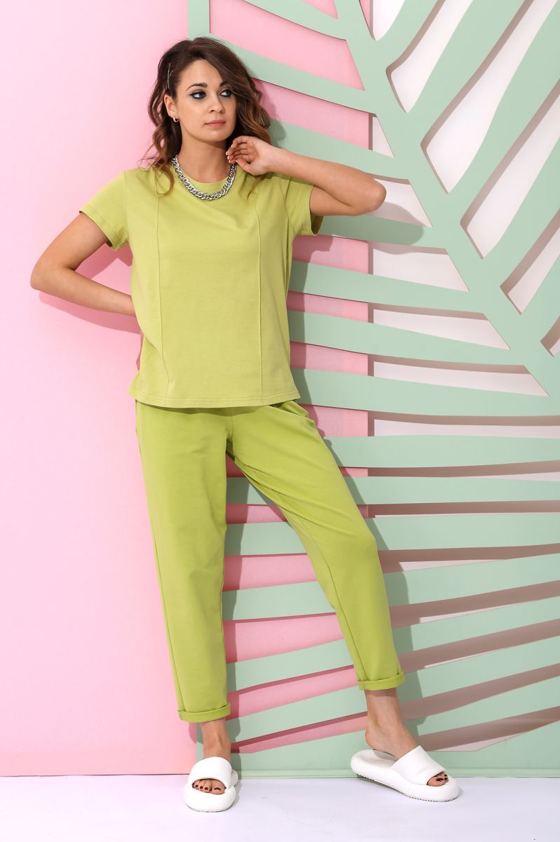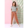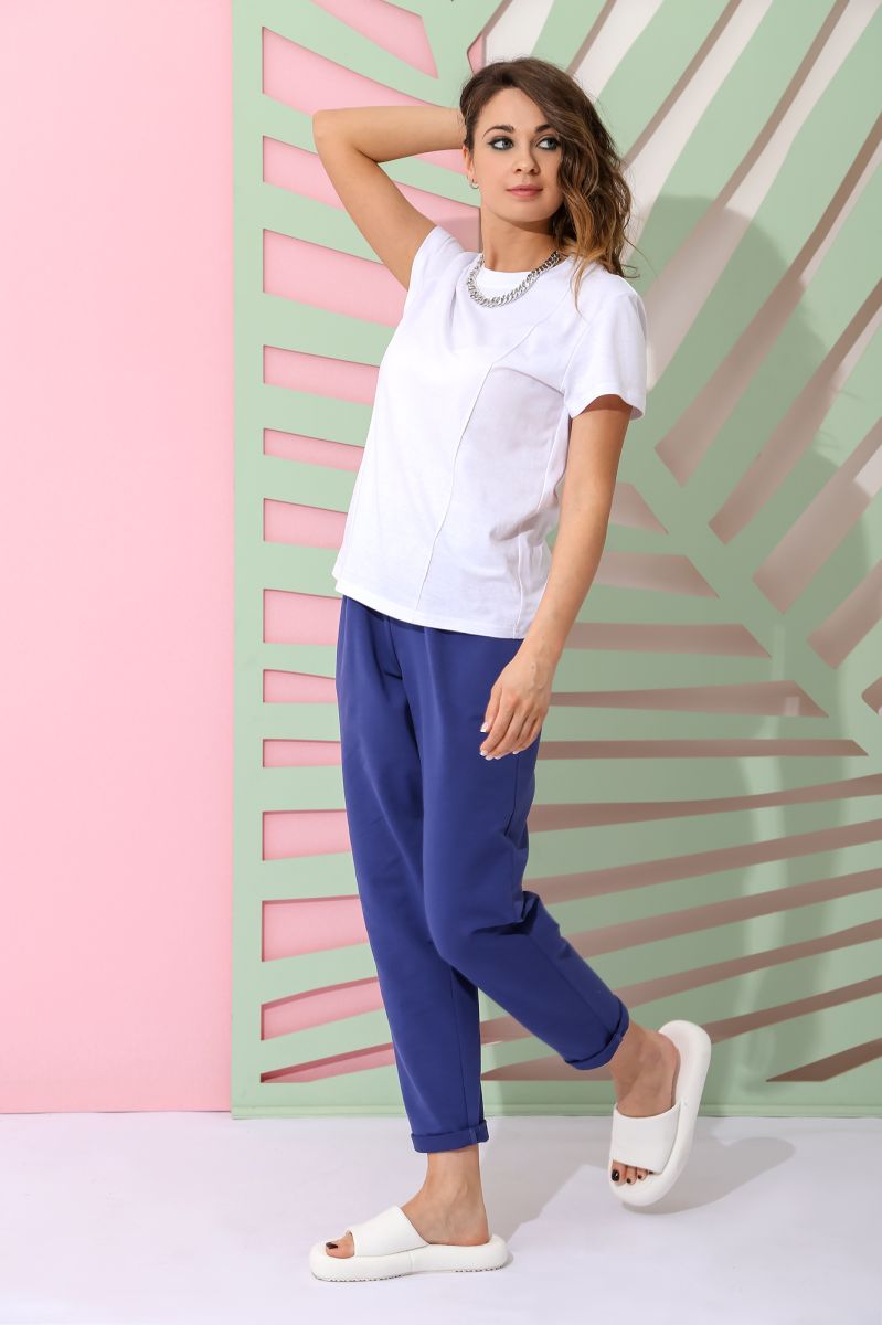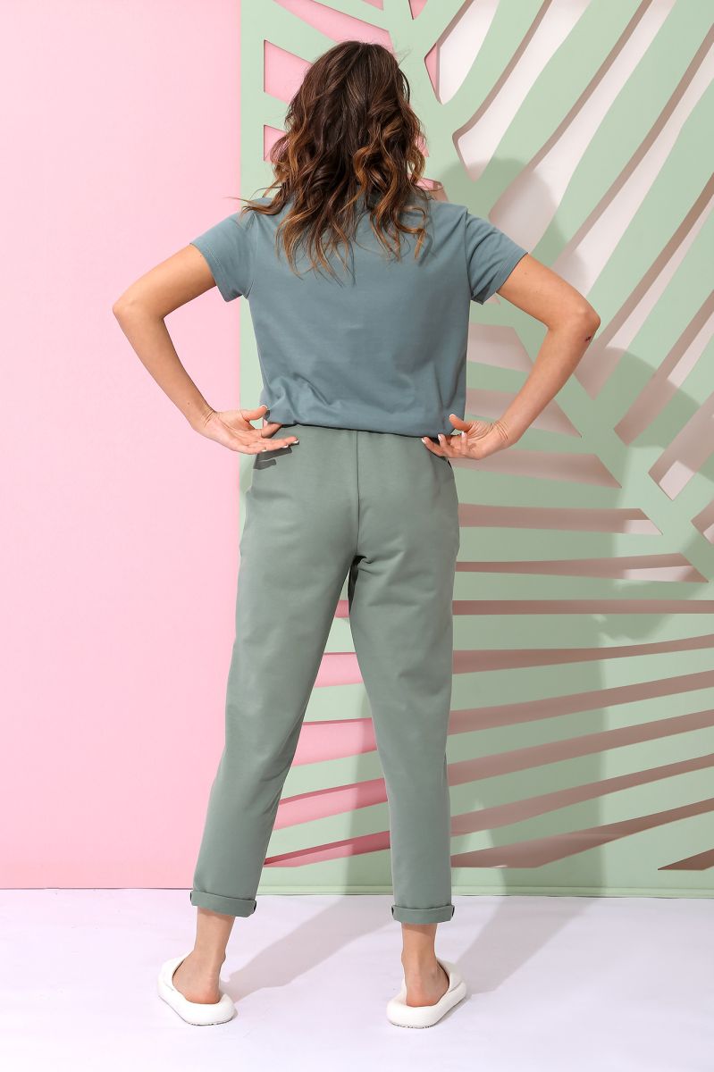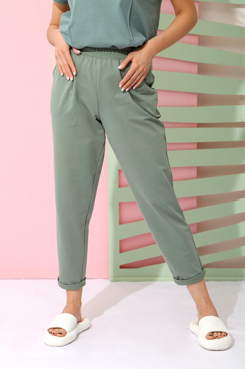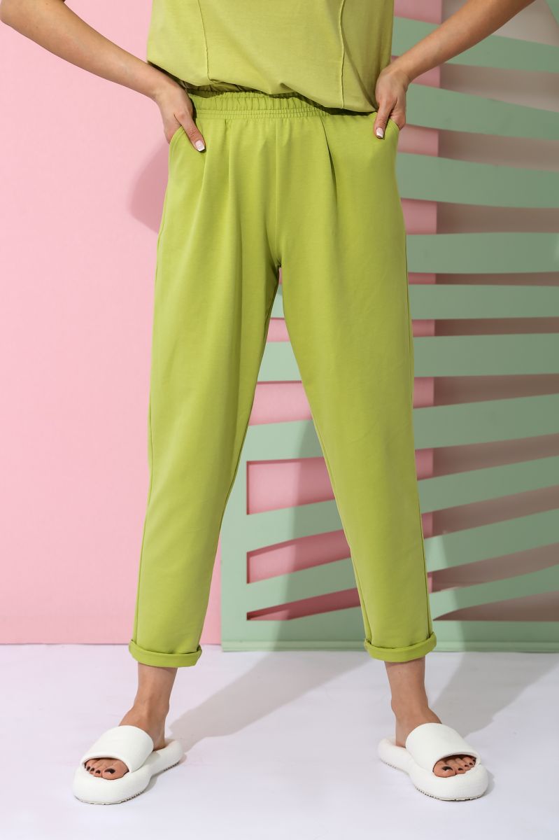 Брюки женские из хлопкового 2-ниточного футера. Модель с небольшими складками на передних деталях от линии талии, пояс с отстроченной эластичной тесьмой и с внутренним шнуром. Предлагаем укоротить брючки, завернув их по низу несколько раз наружу - для создания более раскованного образа, или носить их в классическом варианте.