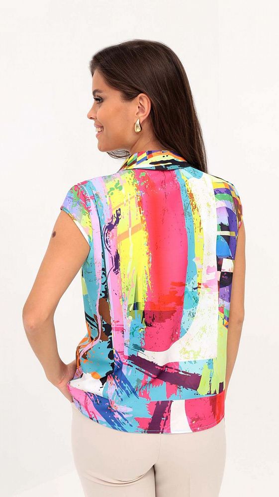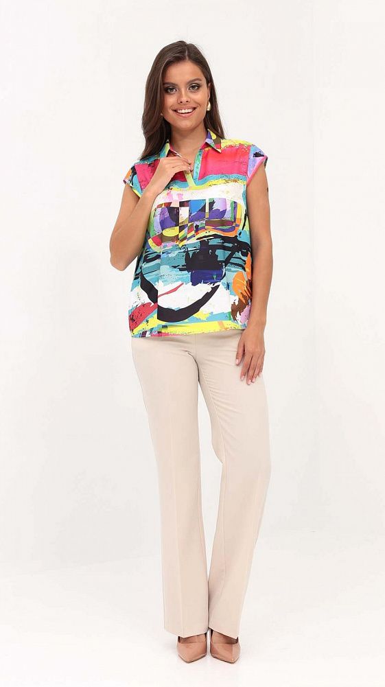 Блуза свободного силуэта. Воротник рубашечный, без застежки. Рукав втачной, крылышко. Низ фигурный с двумя скаладками.