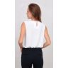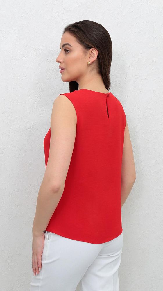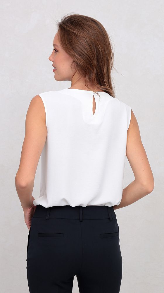Топ прямого кроя. По переду имеются аккуратные складки. Сзади застежка на пуговицу. Изделие без рукавов. Прекрасна в сочетании как с юбками, так и с брюками.